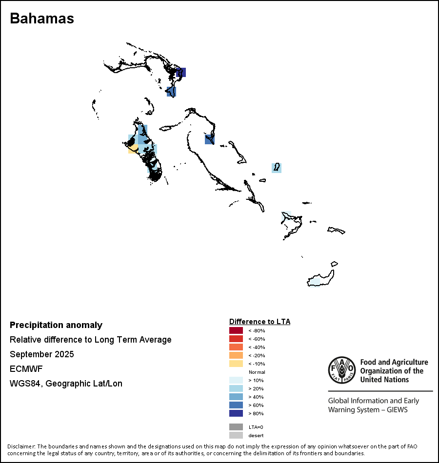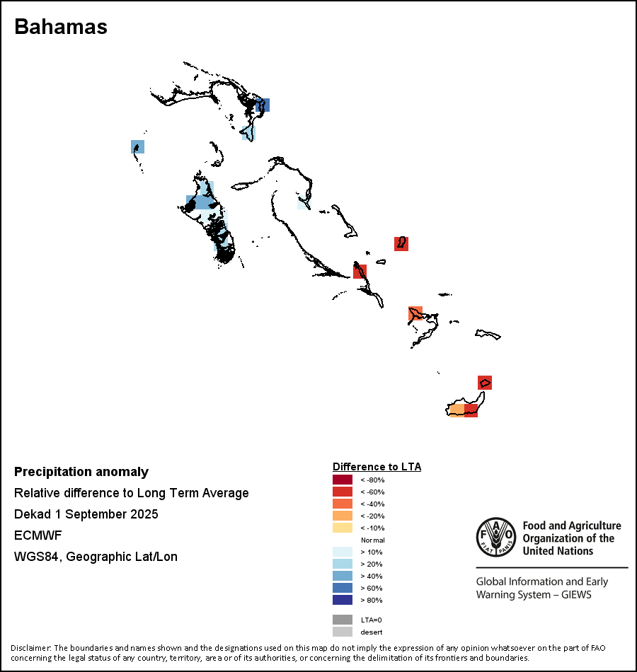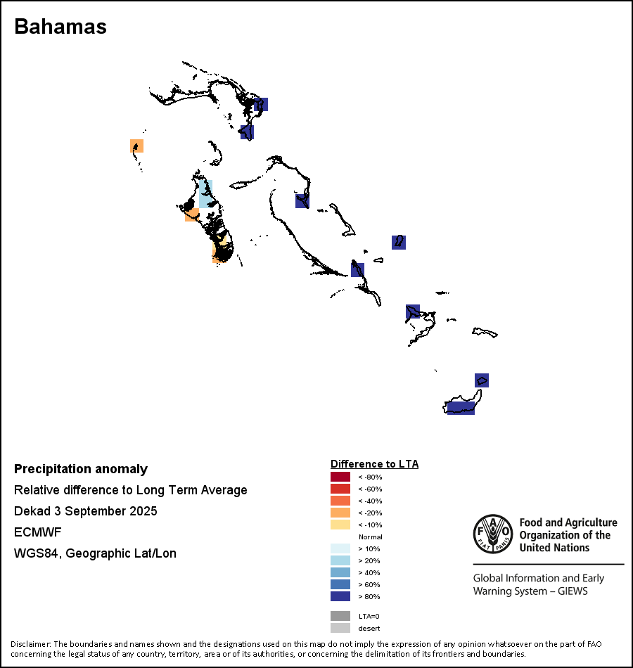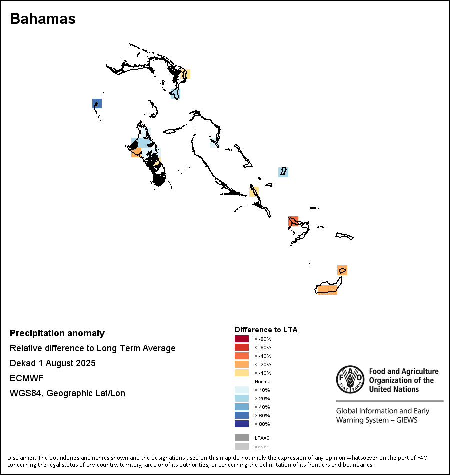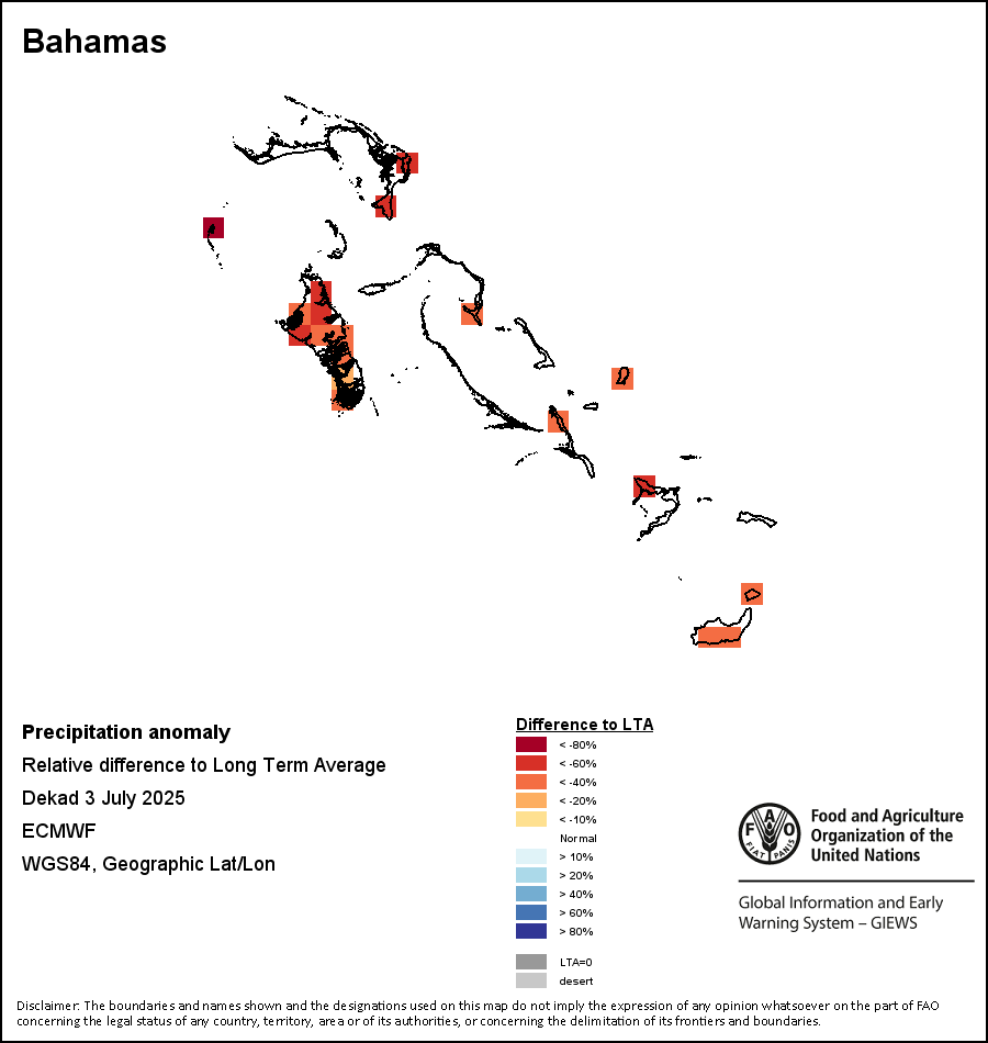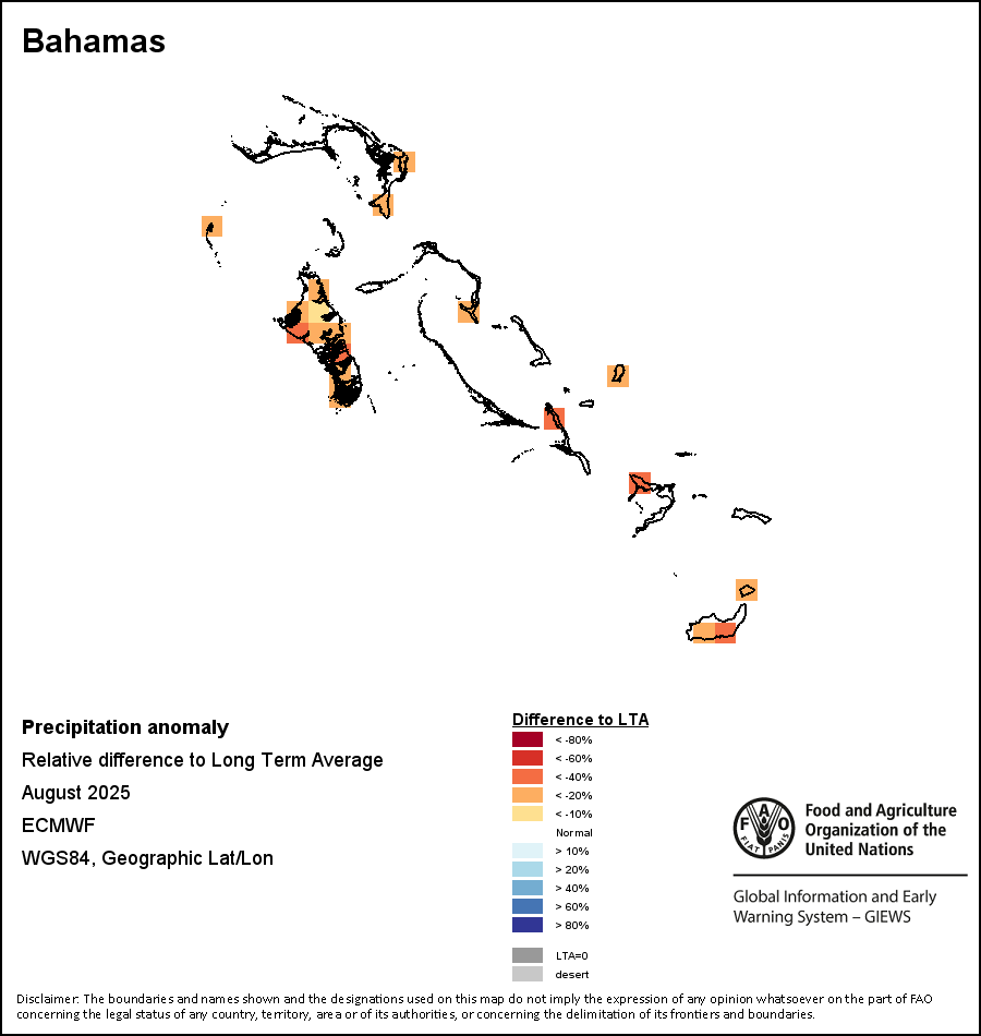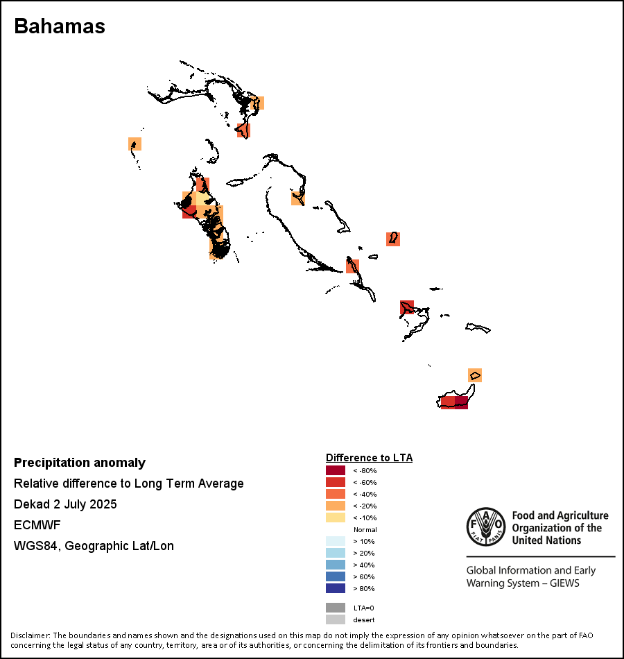 该图谱显示了当前降水量与平均水平之间的差异。 由降水量水平与长期平均值(LTA)进行比较得出,长期平均值系指1989-2015年期间的数值。暖色调指示的是降水量低于平均水平的地区,而冷色调指示的则是降水量高于平均水平的地区。降雨量估算数据来自欧洲中期天气预报这些(ECMWF)。
