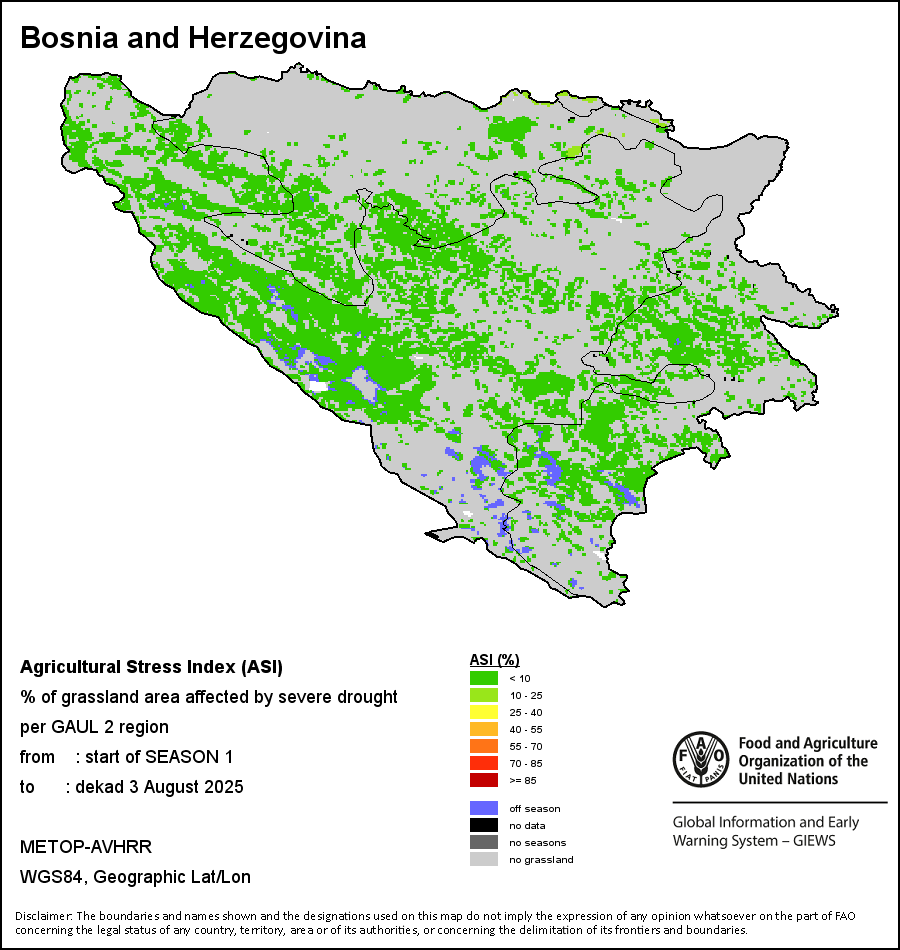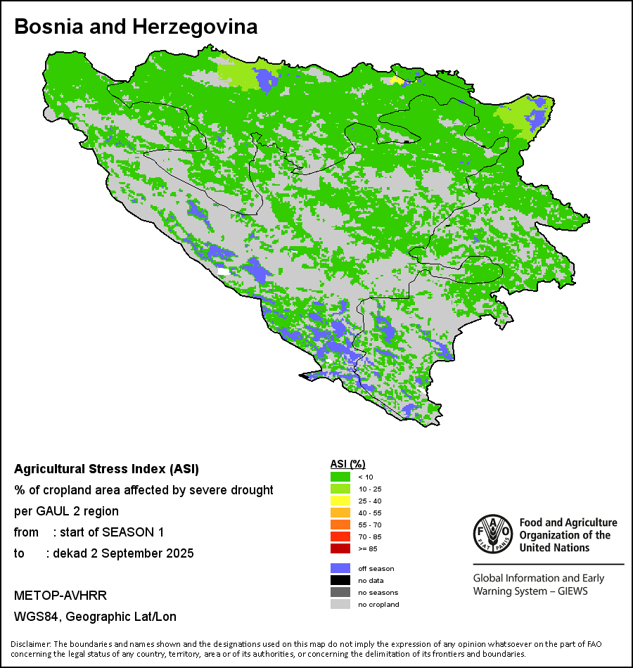 农业干旱胁迫指数(ASI)是一项速览指数,有助于在早期甄别较大可能发生水胁迫(干旱)的耕地。 该指数通过整合植被健康指数(VHI)在评估农业旱情方面具有关键意义的两个维度,即时间和空间维度,而得出。计算农业干旱胁迫指数的第一步是求植被健康指数的时间平均值,对作物周期内旱情的强度和时长进行像素级评估;这项计算包括采用作物系数衡量某种作物在各物候阶段对干旱胁迫的敏感度。第二步是确定旱情的空间广度,方法是计算植被健康指数值低于35%(Kogan前期研究将这一数值确定为评估干旱程度的临界值,1995年)的耕地的像素百分比。然后把各个行政区域根据受影响面积的百分比进行划分,便于对结果进行快速解读。