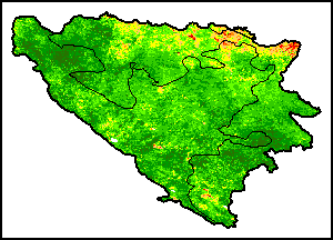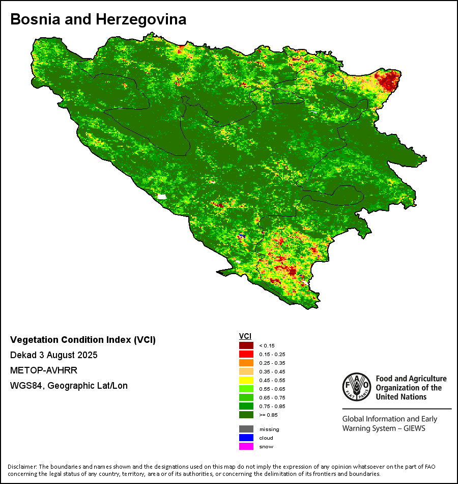 植被健康指数(VHI)根据植被健康状况以及气温对作物状况的影响情况显示干旱的严重程度。 VHI是一项综合指数,是用于计算ASI的基础性指标。它结合了植被状况指数(VCI)和气温状况指数(TCI)。TCI的计算采用了与VCI类似的方程,但它把当前气温与长期最高和最低值联系起来,因为一个假定前提是气温越高就倾向于造成植被状况恶化。比方说,VHI指数下降就意味着植被状况相对较差,而气温越高则意味着植被状况受到胁迫,较长时间延续则成为干旱的指征。VHI映像针对两个主要季节进行计算并分为三种时间模式:旬度、月度和年度。