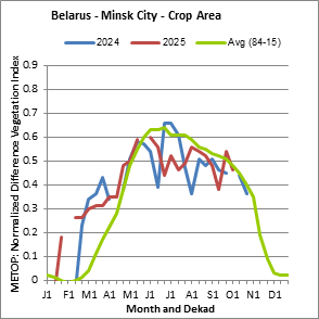 The Weighted Mean Vegetation Health Index (Weighted Mean VHI) allows the user to assess the severity of the drought from the start of the growing season, examining the vegetation health and the influence of temperature on plant conditions. The Mean VHI is an average of the dekadal VHI values over the crop growing season (from the start until the last dekad of analysis), weighted by crop coefficients (Kc), assigned to VHI values at the dekads corresponding to the Start of the Season (SOS), Maximum of the Season (MOS) and End of the Season (EOS). Crop coefficient is applied for the purpose of reflecting the crop’s water sensitivity at different phenology stages.