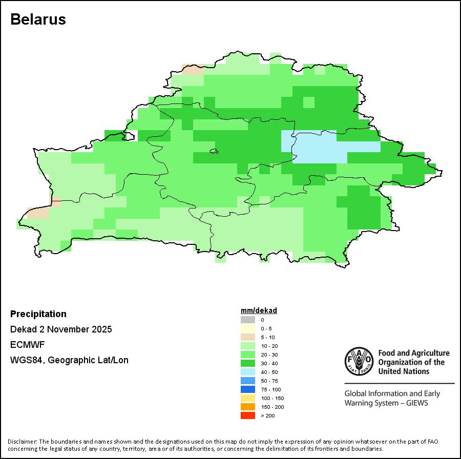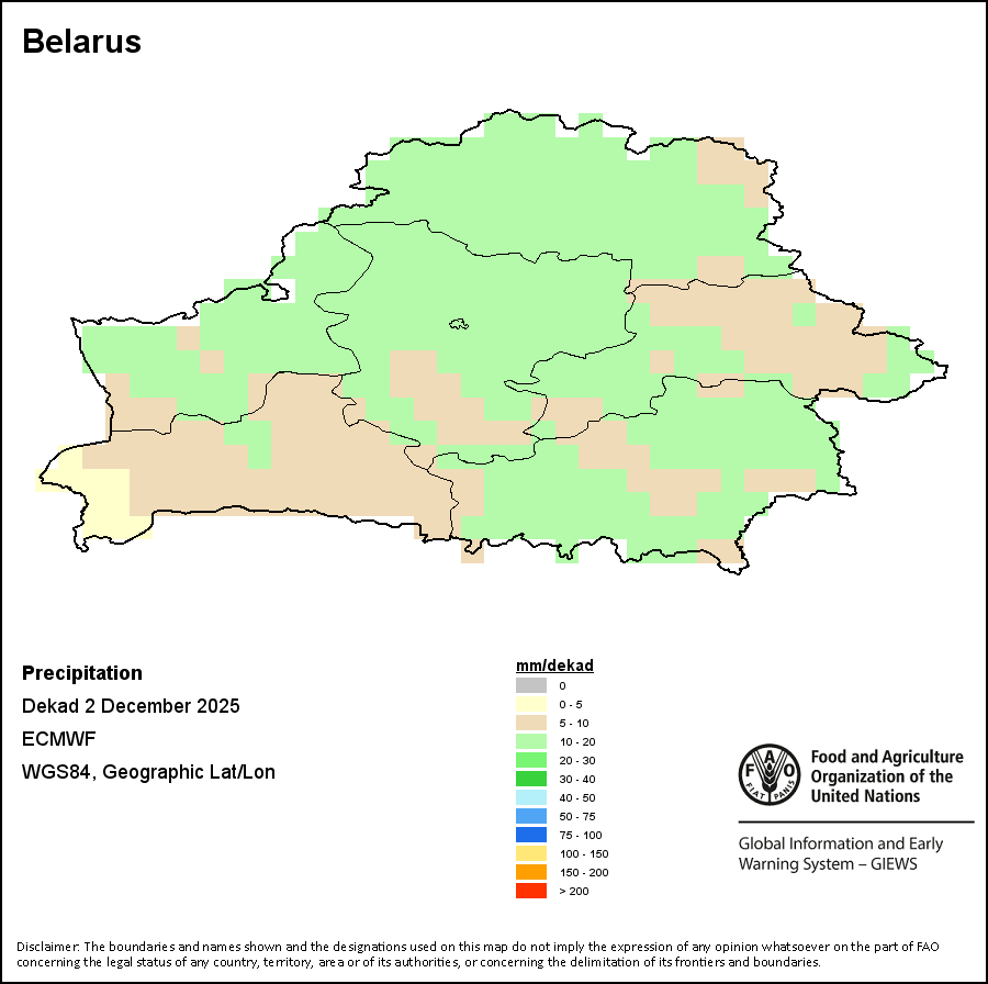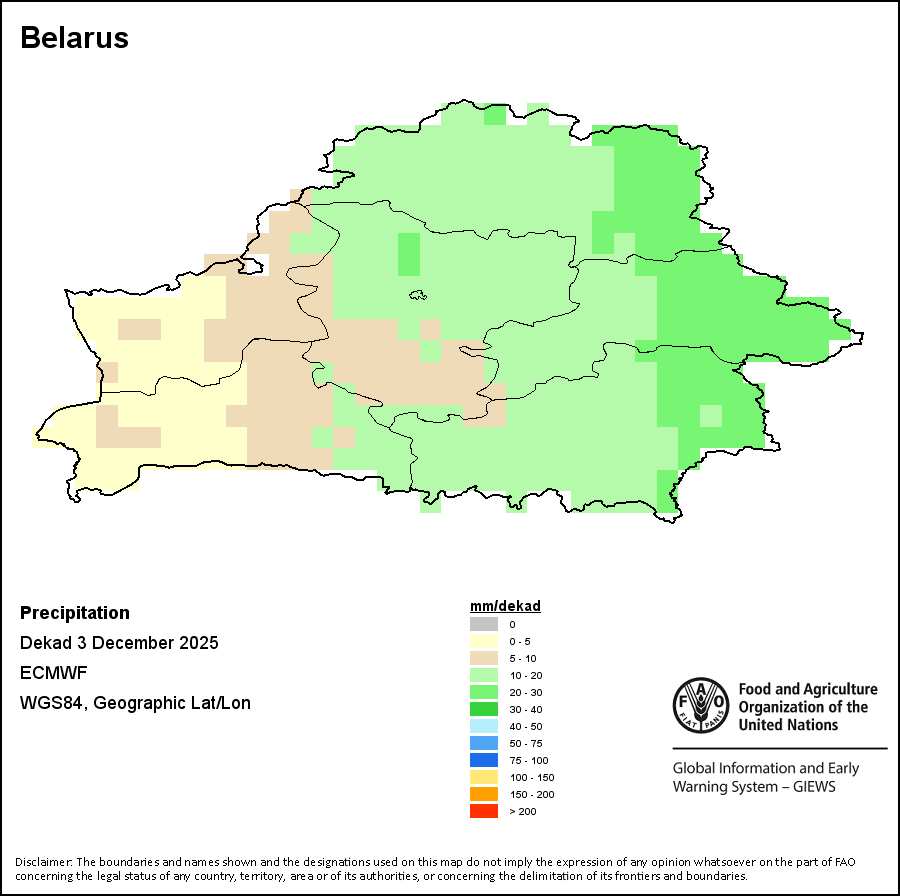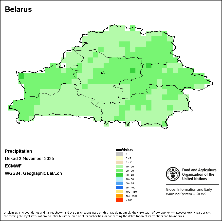 The map depicts cumulative rainfall volumes over a dekad (a 10-day period). Precipitation estimates for all African countries (except Cabo Verde and Mauritius) are taken from NOAA/FEWSNet, while for the remaining countries data is obtained from ECMWF.