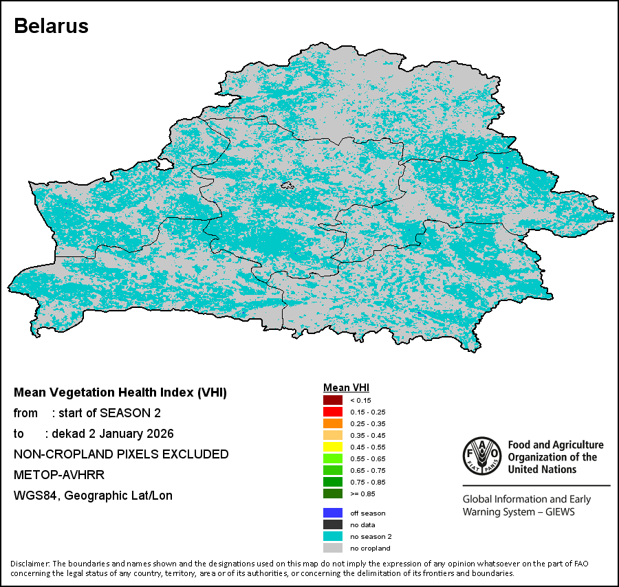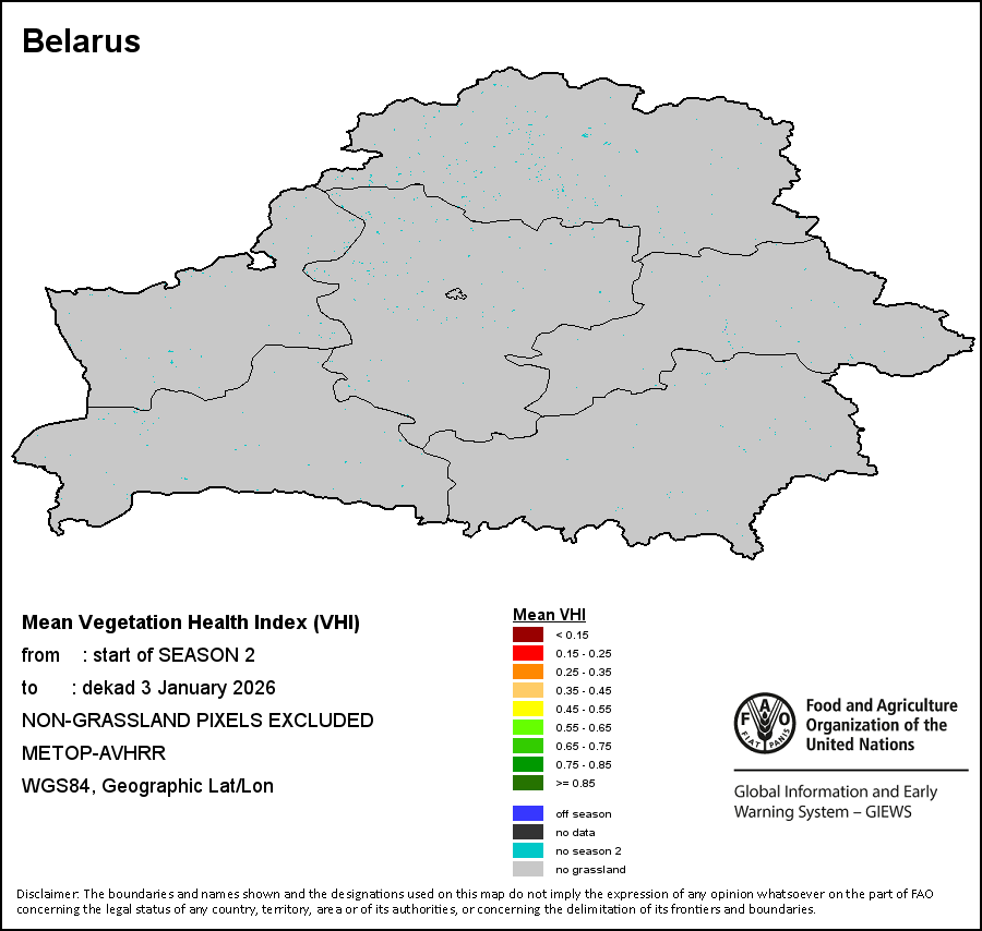 国别地图和图表显示的是最近36个月期间的季节、植被和降水指标。数据按每10天和每月呈现。 所有三项植被指标都是基于来自METOP-AVHRR遥感卫星分辨率1千米的10天(旬)植被数据(2007年及以后)得出的。1984-2006年期间的1千米分辨率数据得自NOAA-AVHRR16千米分辨率数据集。所有非洲国家的降水量估算(除佛得角和毛里求斯外)均取自NOAA/FEWSNet (16千米分辨率),其他国家则取自ECMWF(25千米分辨率)。 由于植被指标(如NDVI、VHI)的空间分辨率高于降水指标,因此,在部分国家能够通过有效分区统计数据计算植被指标的次国家级单元数量,超过能够以相同方式计算降水指标的次国家级单元数量。