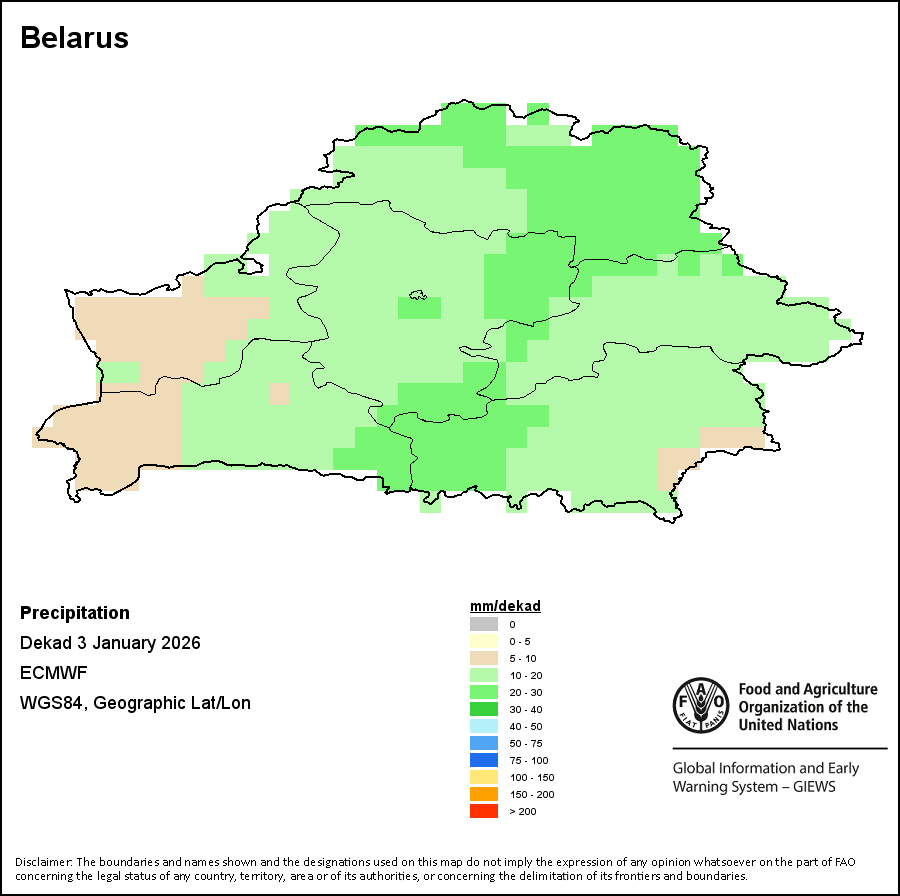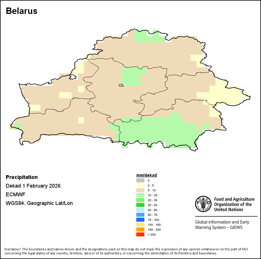 该图谱显示了每一旬(十天)的累积降水量。 所有非洲国家的降水量估算(除佛得角和毛里求斯外)均取自NOAA/FEWSNet,其他国家则取自ECMWF。