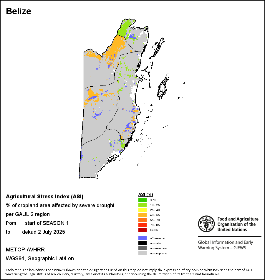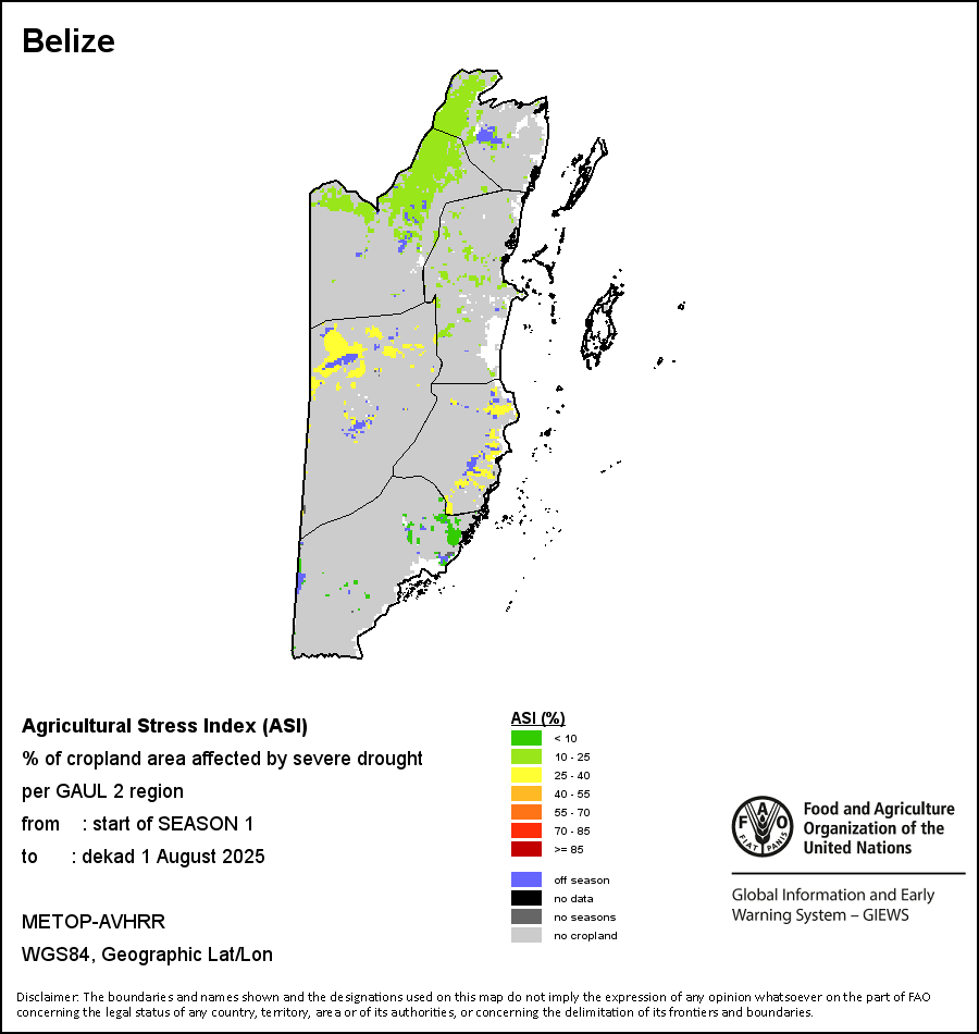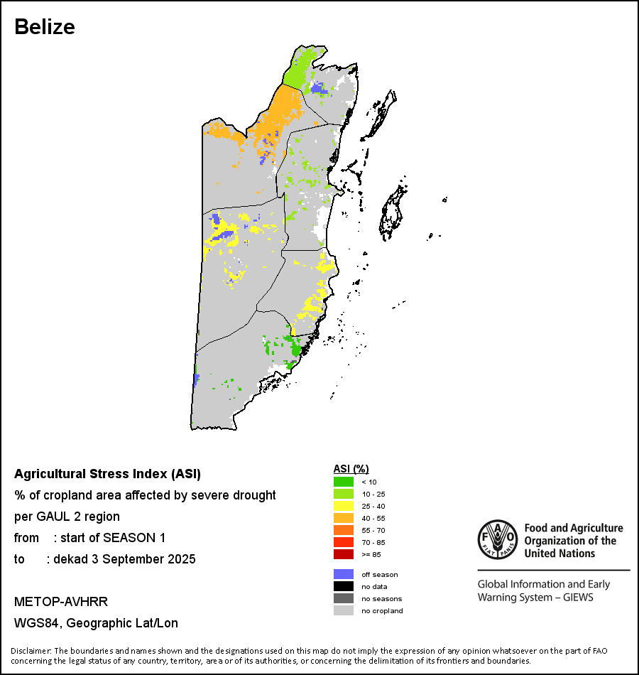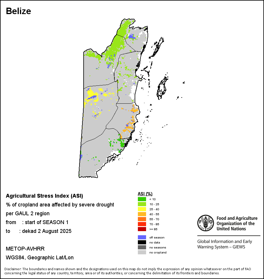 农业干旱胁迫指数(ASI)是一项速览指数,有助于在早期甄别较大可能发生水胁迫(干旱)的耕地。 该指数通过整合植被健康指数(VHI)在评估农业旱情方面具有关键意义的两个维度,即时间和空间维度,而得出。计算农业干旱胁迫指数的第一步是求植被健康指数的时间平均值,对作物周期内旱情的强度和时长进行像素级评估;这项计算包括采用作物系数衡量某种作物在各物候阶段对干旱胁迫的敏感度。第二步是确定旱情的空间广度,方法是计算植被健康指数值低于35%(Kogan前期研究将这一数值确定为评估干旱程度的临界值,1995年)的耕地的像素百分比。然后把各个行政区域根据受影响面积的百分比进行划分,便于对结果进行快速解读。
