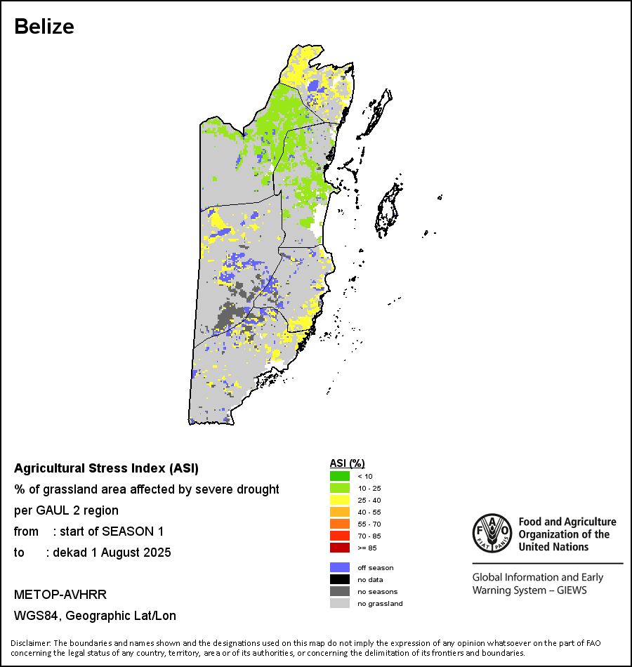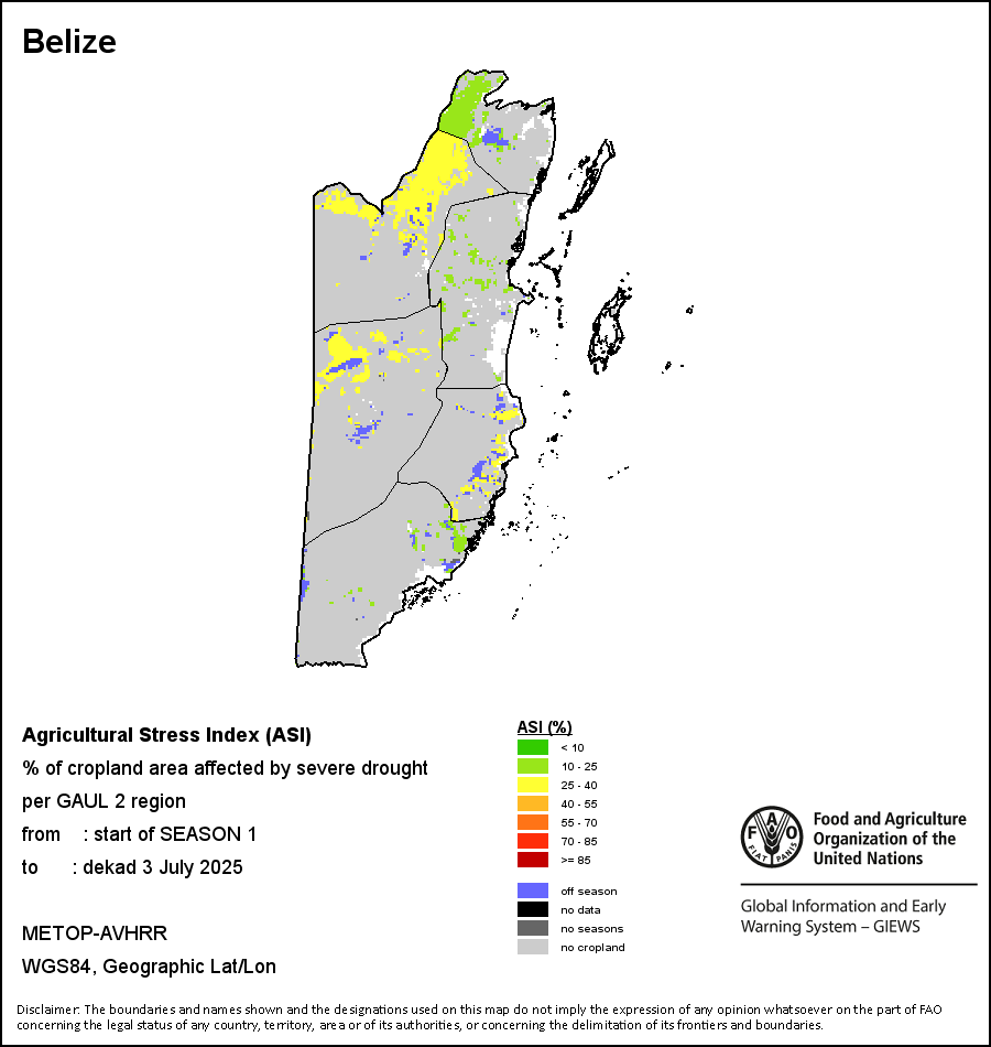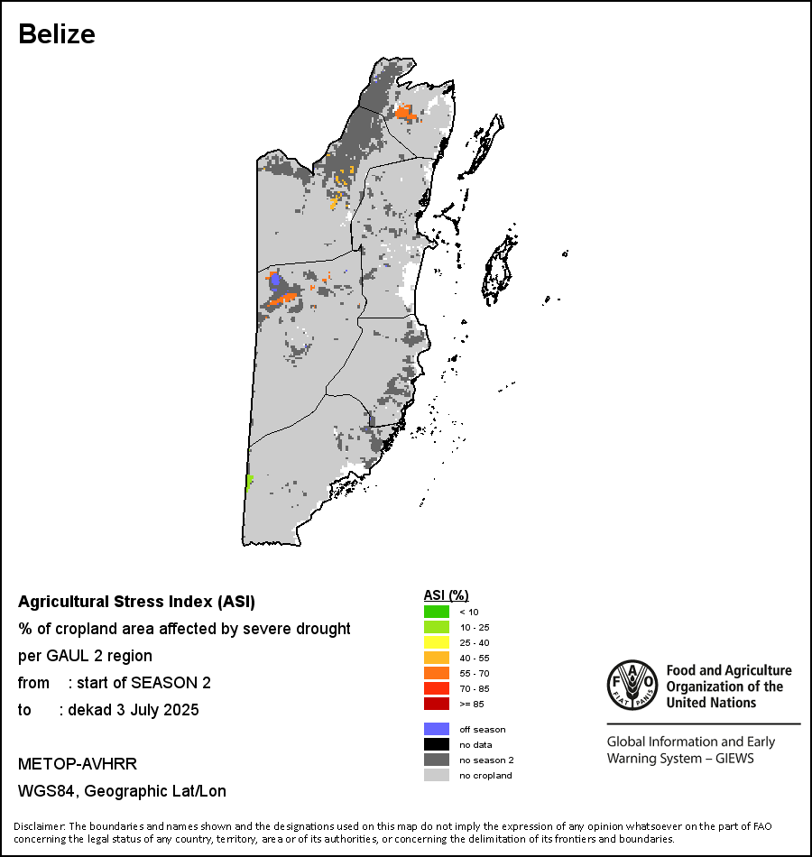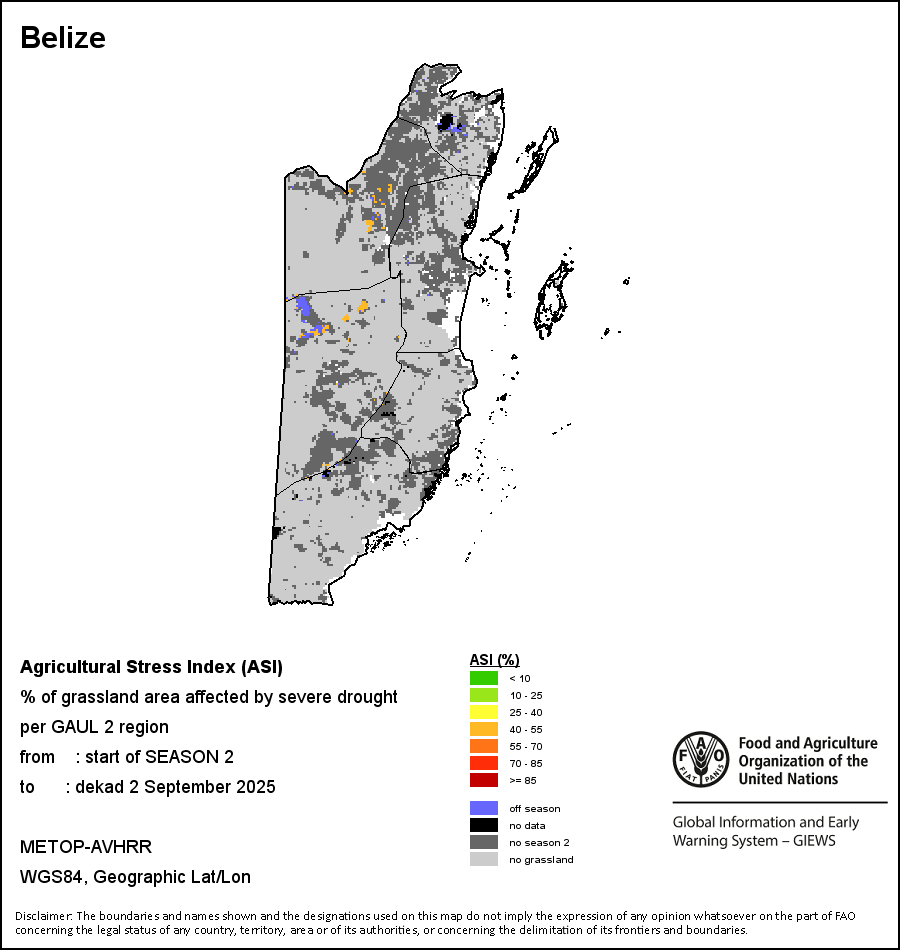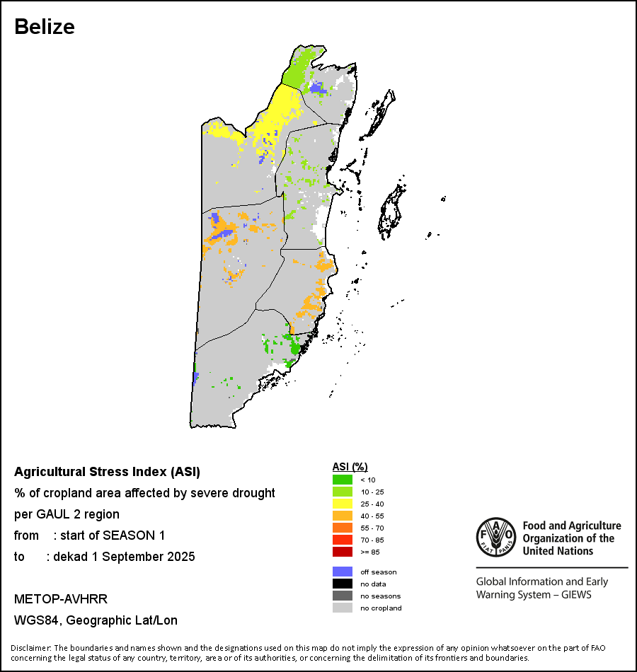 农业干旱胁迫指数(ASI)是一项速览指数,有助于在早期甄别较大可能发生水胁迫(干旱)的耕地。 该指数通过整合植被健康指数(VHI)在评估农业旱情方面具有关键意义的两个维度,即时间和空间维度,而得出。计算农业干旱胁迫指数的第一步是求植被健康指数的时间平均值,对作物周期内旱情的强度和时长进行像素级评估;这项计算包括采用作物系数衡量某种作物在各物候阶段对干旱胁迫的敏感度。第二步是确定旱情的空间广度,方法是计算植被健康指数值低于35%(Kogan前期研究将这一数值确定为评估干旱程度的临界值,1995年)的耕地的像素百分比。然后把各个行政区域根据受影响面积的百分比进行划分,便于对结果进行快速解读。