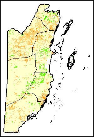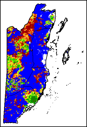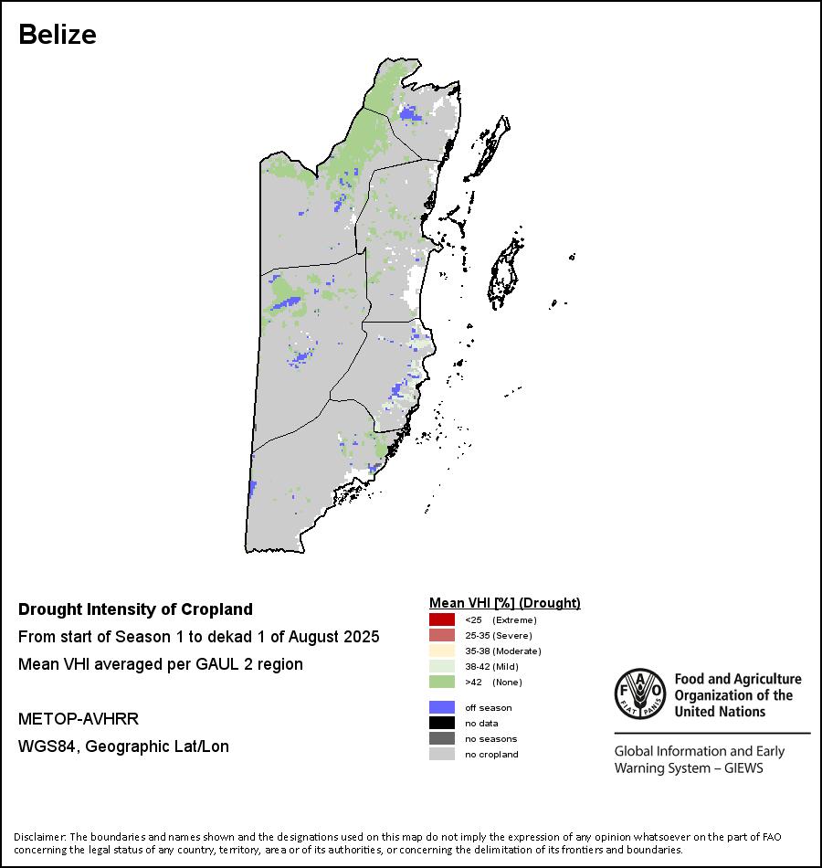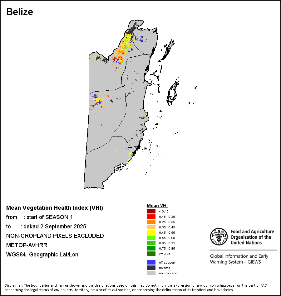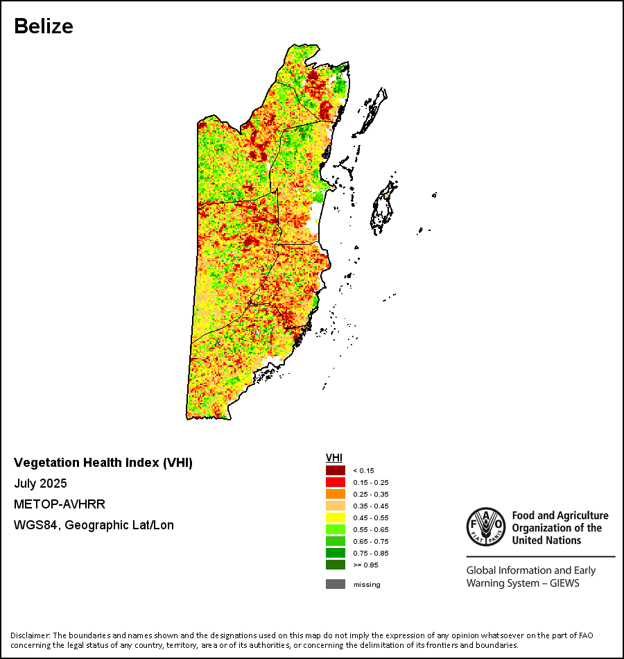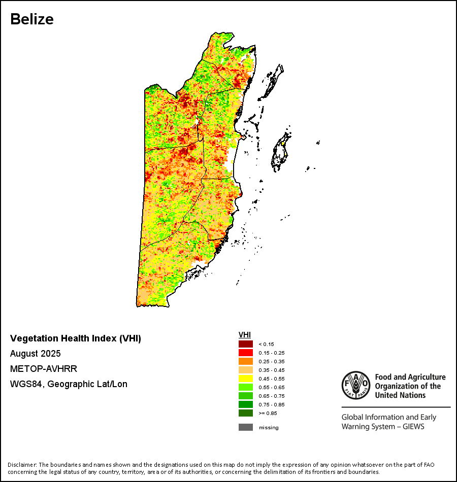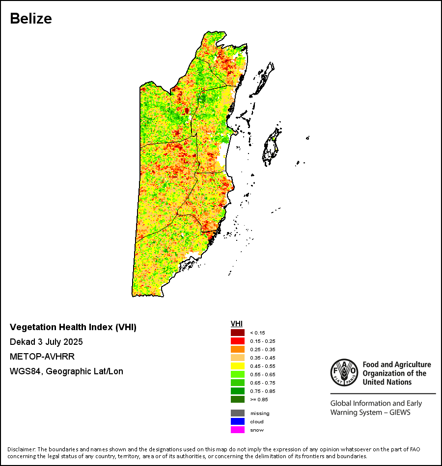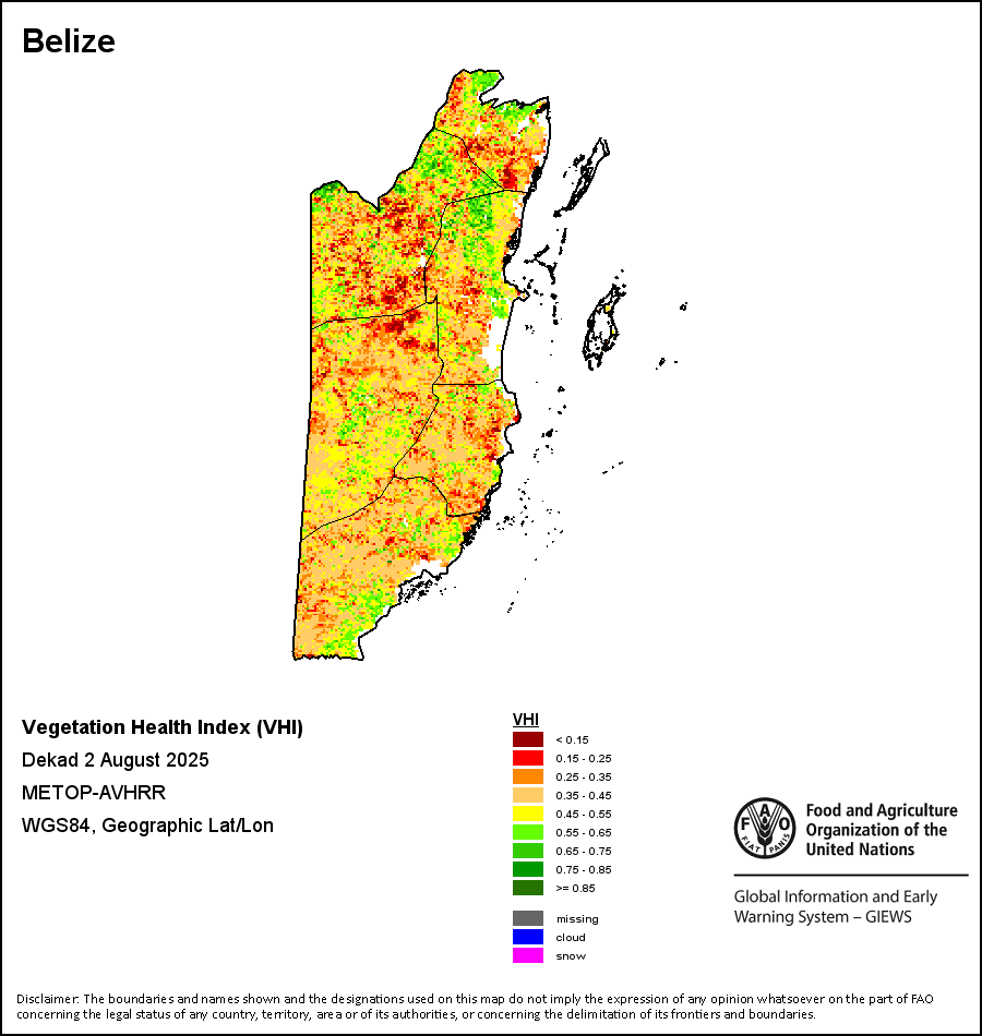 植被健康指数(VHI)根据植被健康状况以及气温对作物状况的影响情况显示干旱的严重程度。 VHI是一项综合指数,是用于计算ASI的基础性指标。它结合了植被状况指数(VCI)和气温状况指数(TCI)。TCI的计算采用了与VCI类似的方程,但它把当前气温与长期最高和最低值联系起来,因为一个假定前提是气温越高就倾向于造成植被状况恶化。比方说,VHI指数下降就意味着植被状况相对较差,而气温越高则意味着植被状况受到胁迫,较长时间延续则成为干旱的指征。VHI映像针对两个主要季节进行计算并分为三种时间模式:旬度、月度和年度。