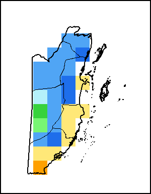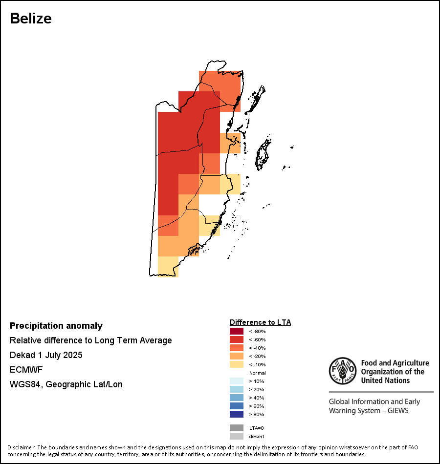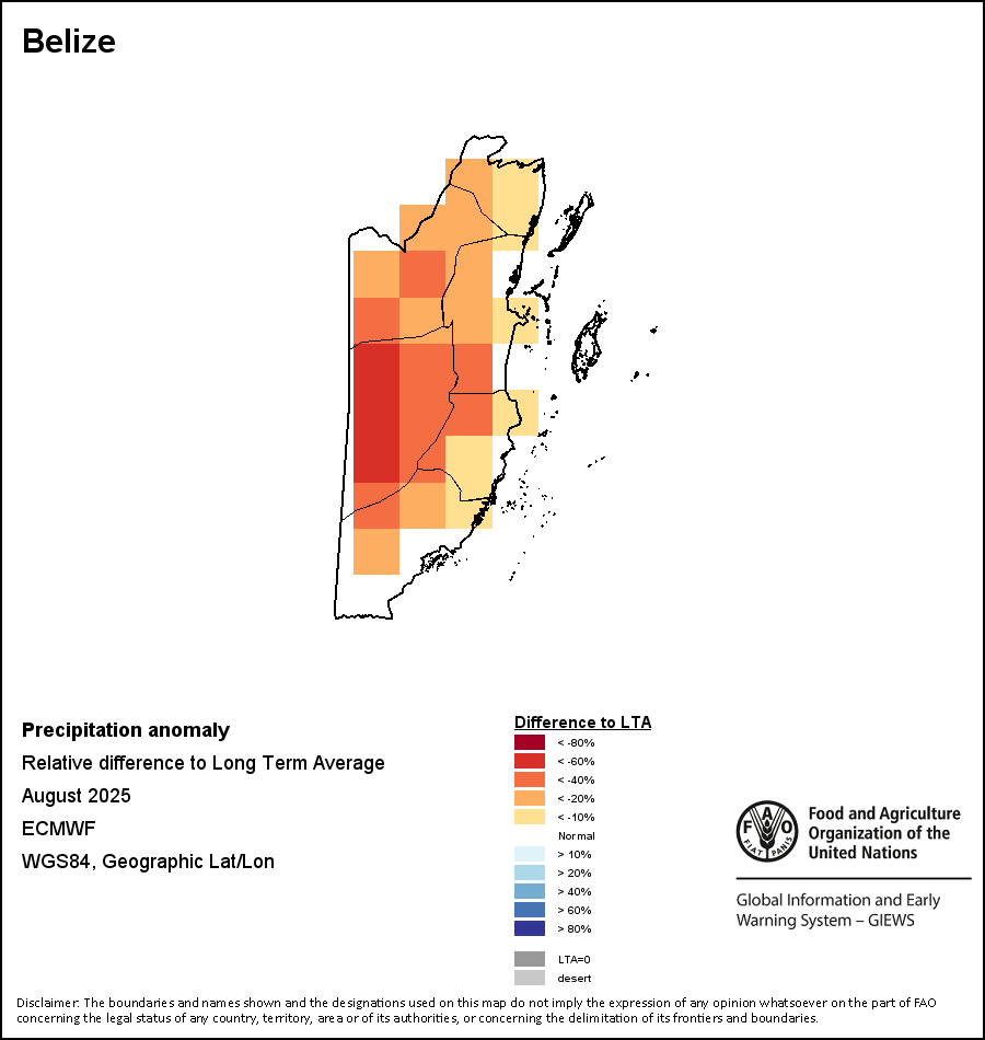 该图谱显示了当前降水量与平均水平之间的差异。 由降水量水平与长期平均值(LTA)进行比较得出,长期平均值系指1989-2015年期间的数值。暖色调指示的是降水量低于平均水平的地区,而冷色调指示的则是降水量高于平均水平的地区。降雨量估算数据来自欧洲中期天气预报这些(ECMWF)。
