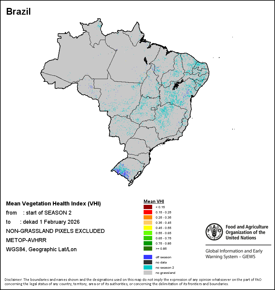 На картах и графиках на уровне страны показывается последний период в 36 месяцев по сезонным показателям, показателям растительного покрова и уровня атмосферных осадков. Данные представляются по 10-дневным периодам и по месяцам. Все три показателя растительного покрова основаны на 10-дневных данных по растительному покрову, полученных от сенсора METOR-AVHRR при разрешении в 1 км (начиная с 2007 года). Данные при разрешении в 1 км за период 1984-2006 гг. были получены из банка данных NOAA-AVHRR при разрешении в 16 км. Оценки атмосферных осадков для всех африканских стран (за исключением Кабо-Верде и Маврикия) получены из системы NOAA/Системы раннего предупреждения об опасности голода (разрешении в 16 km), а по остальным странам данные получены из системы ECMWF (разрешении в 25 km). Благодаря более высокой разрешающей способности показателей состояния растительного покрова (например, NDVI, VHI) по сравнению с показателями осадков, у некоторых стран количество субнациональных единиц, для которых можно получить действительную статистику по данным показателям, больше, чем по показателям осадков.