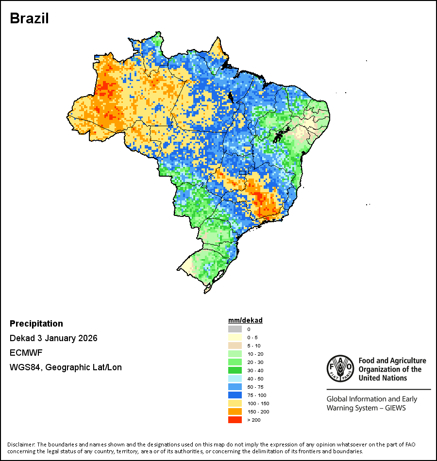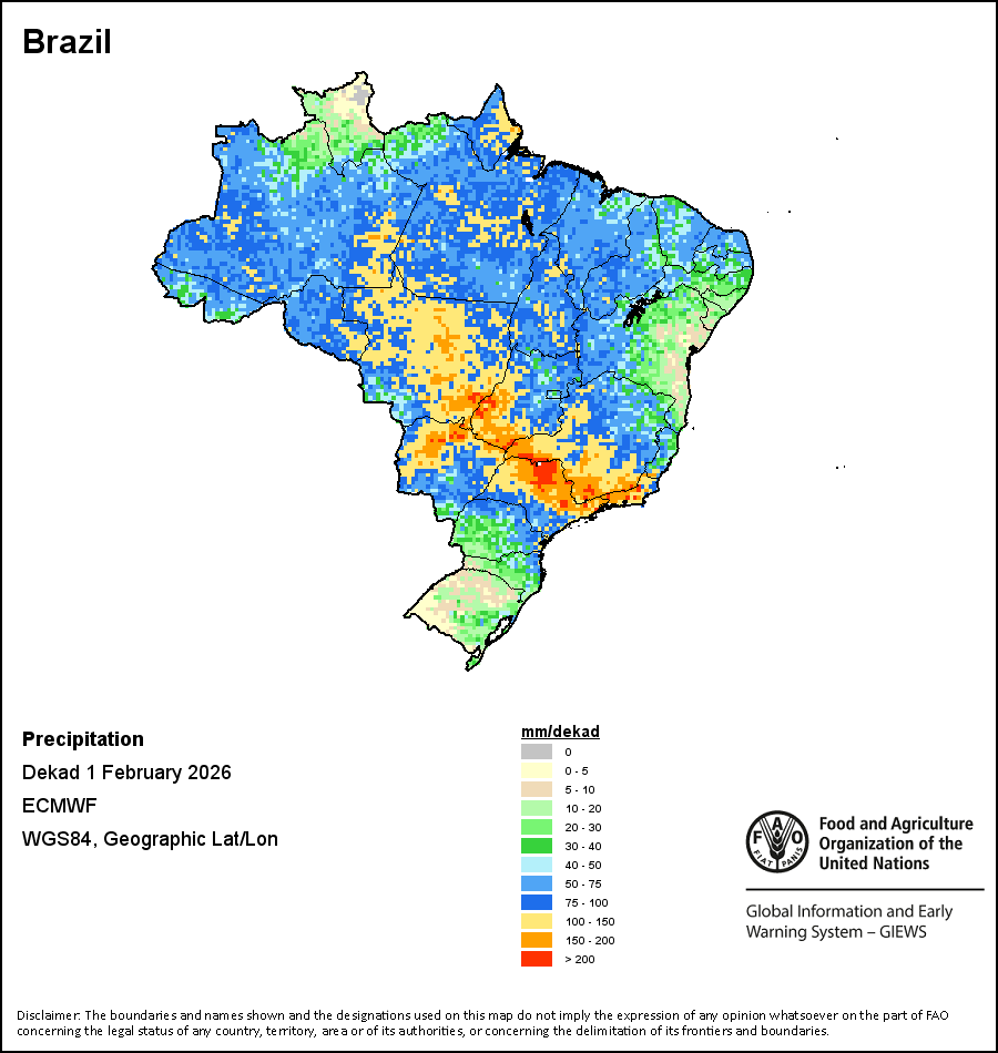 На карте изображены кумулятивные объемы осадков в декаду (10-дневный период). Оценки атмосферных осадков для всех африканских стран (за исключением Кабо-Верде и Маврикия) получены из системы NOAA/Системы раннего предупреждения об опасности голода, а по остальным странам данные получены из системы ECMWF.