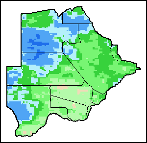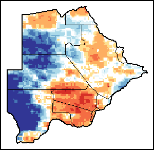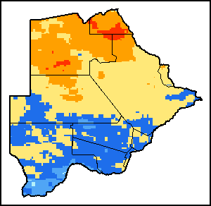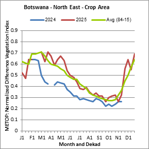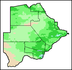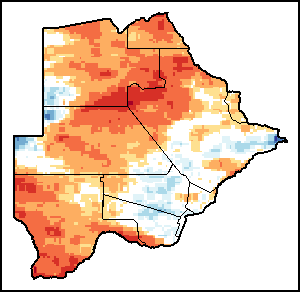 The Normalized Difference Vegetation Index (NDVI) measures the “greenness” of ground cover and is used as a proxy to indicate the density and health of vegetation. NDVI values range from +1 to -1, with high positive values corresponding to dense and healthy vegetation, and low and/or negative NDVI values indicating poor vegetation conditions or sparse vegetative cover. The NDVI anomaly indicates the variation of the current dekad to the long-term average, where a positive value (for example 20 percent) would signify enhanced vegetation conditions compared to the average, while a negative value (for instance -40 percent) would indicate comparatively poor vegetation conditions.