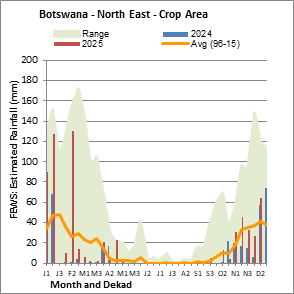 The country level maps and graphs depict the latest 36-month period of the seasonal, vegetation and precipitation indicators. The data is presented by dekad and month. All three vegetation indicators are based on 10-day (dekadal) vegetation data from the METOP-AVHRR sensor at 1 km resolution (2007 and after). Data at 1 km resolution for the period 1984-2006 are derived from the NOAA-AVHRR dataset at 16 km resolution. Precipitation estimates for all African countries (except Cabo Verde and Mauritius) are taken from NOAA/FEWSNet (16 km resolution), while for the remaining countries data is obtained from ECMWF (25 km resolution). Owing to the higher resolution of vegetation indicators (e.g., NDVI, VHI) compared to coarser precipitation indicators, the number of sub-national units for which valid zonal statistics can be generated for vegetation indices is greater than the number of units for precipitation indicators for certain countries.