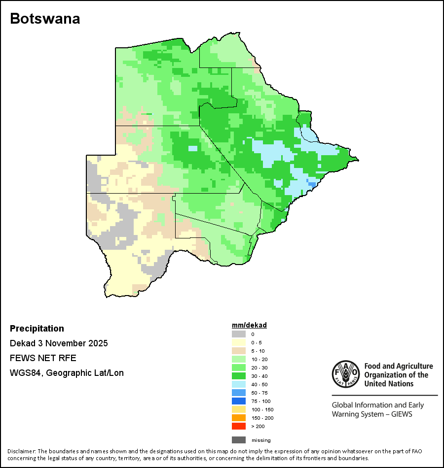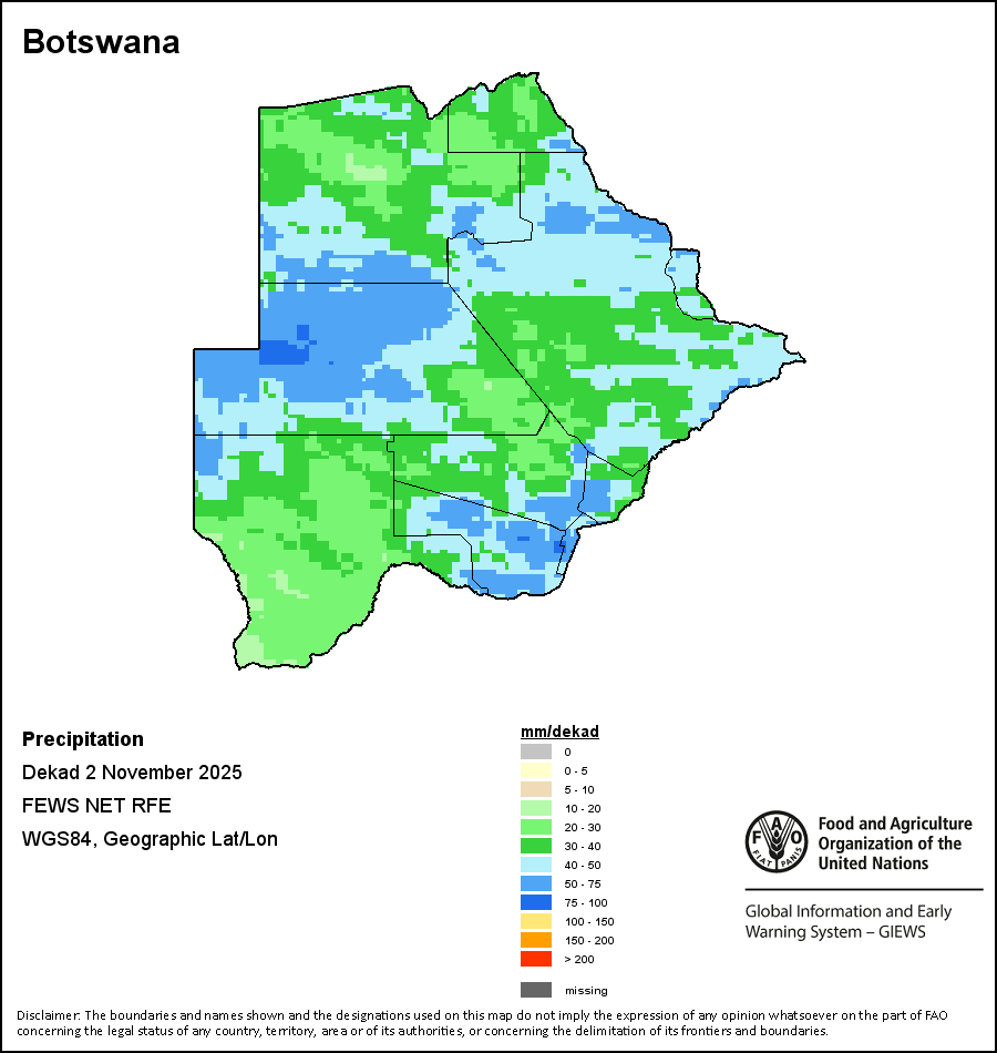 The map depicts cumulative rainfall volumes over a dekad (a 10-day period). Precipitation estimates for all African countries (except Cabo Verde and Mauritius) are taken from NOAA/FEWSNet, while for the remaining countries data is obtained from ECMWF.