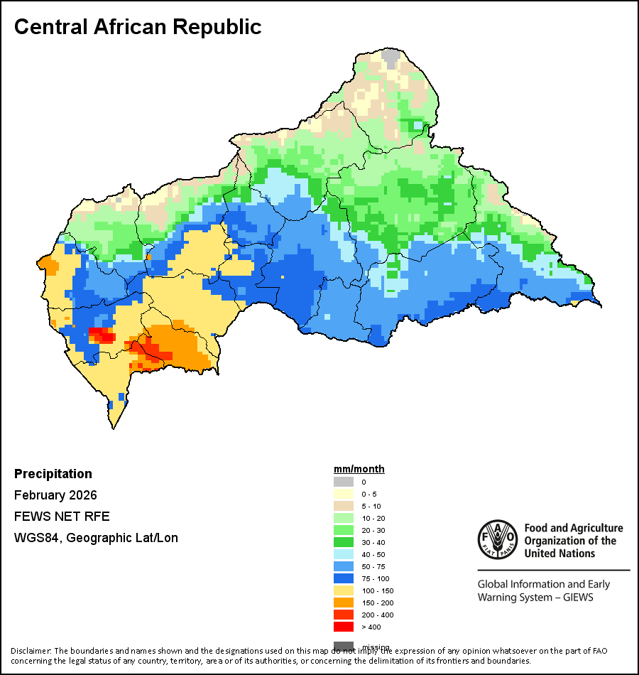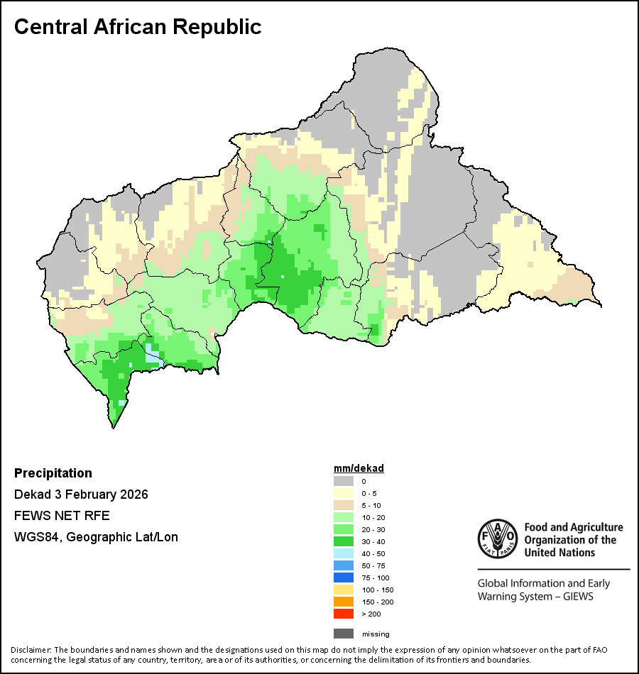 The country level maps and graphs depict the latest 36-month period of the seasonal, vegetation and precipitation indicators. The data is presented by dekad and month. All three vegetation indicators are based on 10-day (dekadal) vegetation data from the METOP-AVHRR sensor at 1 km resolution (2007 and after). Data at 1 km resolution for the period 1984-2006 are derived from the NOAA-AVHRR dataset at 16 km resolution. Precipitation estimates for all African countries (except Cabo Verde and Mauritius) are taken from NOAA/FEWSNet (16 km resolution), while for the remaining countries data is obtained from ECMWF (25 km resolution). Owing to the higher resolution of vegetation indicators (e.g., NDVI, VHI) compared to coarser precipitation indicators, the number of sub-national units for which valid zonal statistics can be generated for vegetation indices is greater than the number of units for precipitation indicators for certain countries.