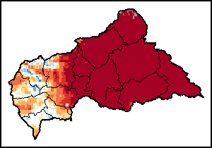 The Normalized Difference Vegetation Index (NDVI) measures the “greenness” of ground cover and is used as a proxy to indicate the density and health of vegetation. NDVI values range from +1 to -1, with high positive values corresponding to dense and healthy vegetation, and low and/or negative NDVI values indicating poor vegetation conditions or sparse vegetative cover. The NDVI anomaly indicates the variation of the current dekad to the long-term average, where a positive value (for example 20 percent) would signify enhanced vegetation conditions compared to the average, while a negative value (for instance -40 percent) would indicate comparatively poor vegetation conditions.