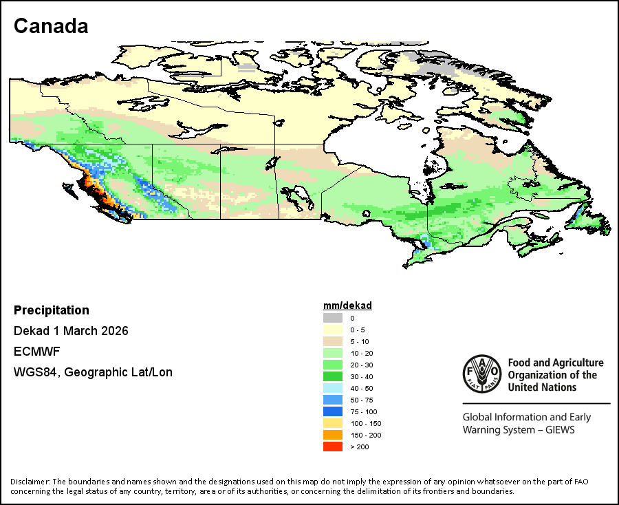 The map depicts cumulative rainfall volumes over a dekad (a 10-day period). Precipitation estimates for all African countries (except Cabo Verde and Mauritius) are taken from NOAA/FEWSNet, while for the remaining countries data is obtained from ECMWF.
