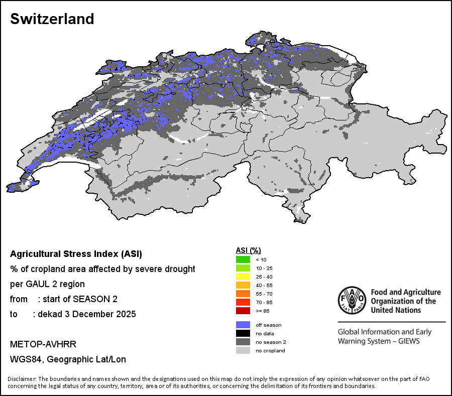 The Agricultural Stress Index (ASI) is a quick-look indicator that facilitates the early identification of cropped land with a high likelihood of water stress (drought). The Index is based on the integration of the Vegetation Health Index (VHI) in two dimensions that are critical in the assessment of a drought event in agriculture: temporal and spatial. The first step of the ASI calculation is a temporal averaging of the VHI, assessing the intensity and duration of dry periods occurring during the crop cycle at the pixel level; this calculation includes the use of crop coefficients, which introduces sensitivity of a crop to water stress during each phenological phase. The second step determines the spatial extent of drought events by calculating the percentage of pixels in arable areas with a VHI value below 35 percent (this value was identified as a critical threshold in assessing the extent of drought in previous research by Kogan, 1995). Each administrative area is classified according to the percentage of the affected area to facilitate the quick interpretation of results.