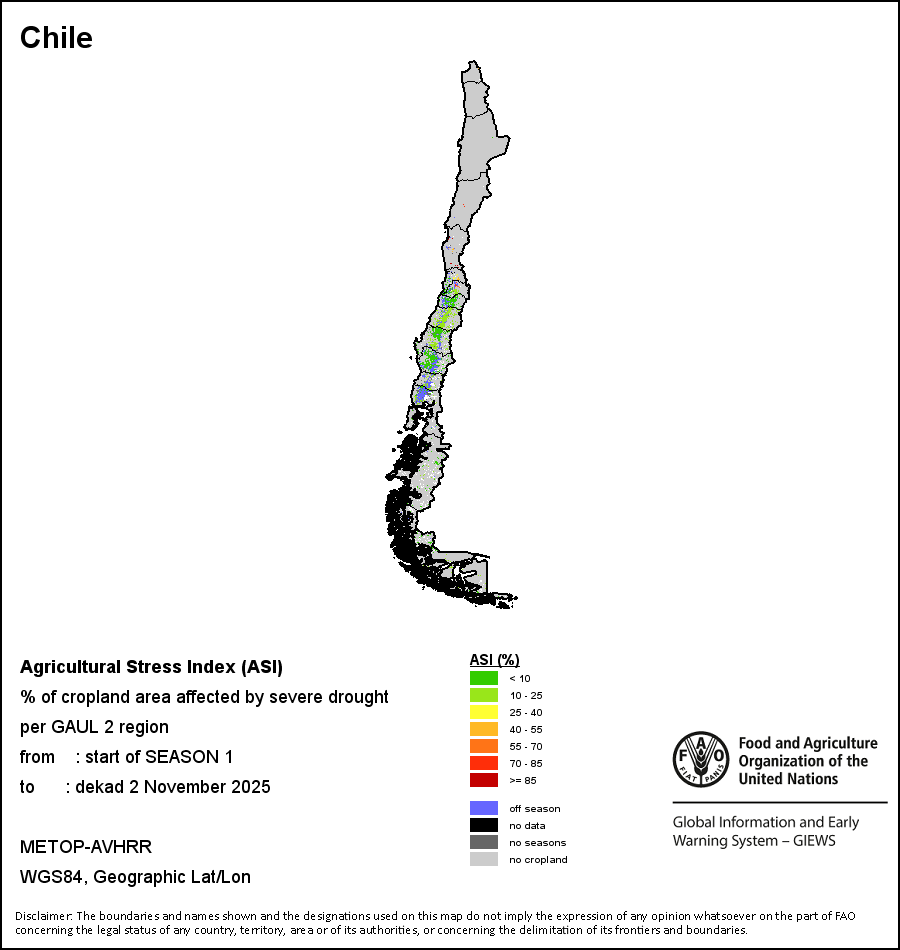 The Agricultural Stress Index (ASI) is a quick-look indicator that facilitates the early identification of cropped land with a high likelihood of water stress (drought). The Index is based on the integration of the Vegetation Health Index (VHI) in two dimensions that are critical in the assessment of a drought event in agriculture: temporal and spatial. The first step of the ASI calculation is a temporal averaging of the VHI, assessing the intensity and duration of dry periods occurring during the crop cycle at the pixel level; this calculation includes the use of crop coefficients, which introduces sensitivity of a crop to water stress during each phenological phase. The second step determines the spatial extent of drought events by calculating the percentage of pixels in arable areas with a VHI value below 35 percent (this value was identified as a critical threshold in assessing the extent of drought in previous research by Kogan, 1995). Each administrative area is classified according to the percentage of the affected area to facilitate the quick interpretation of results.