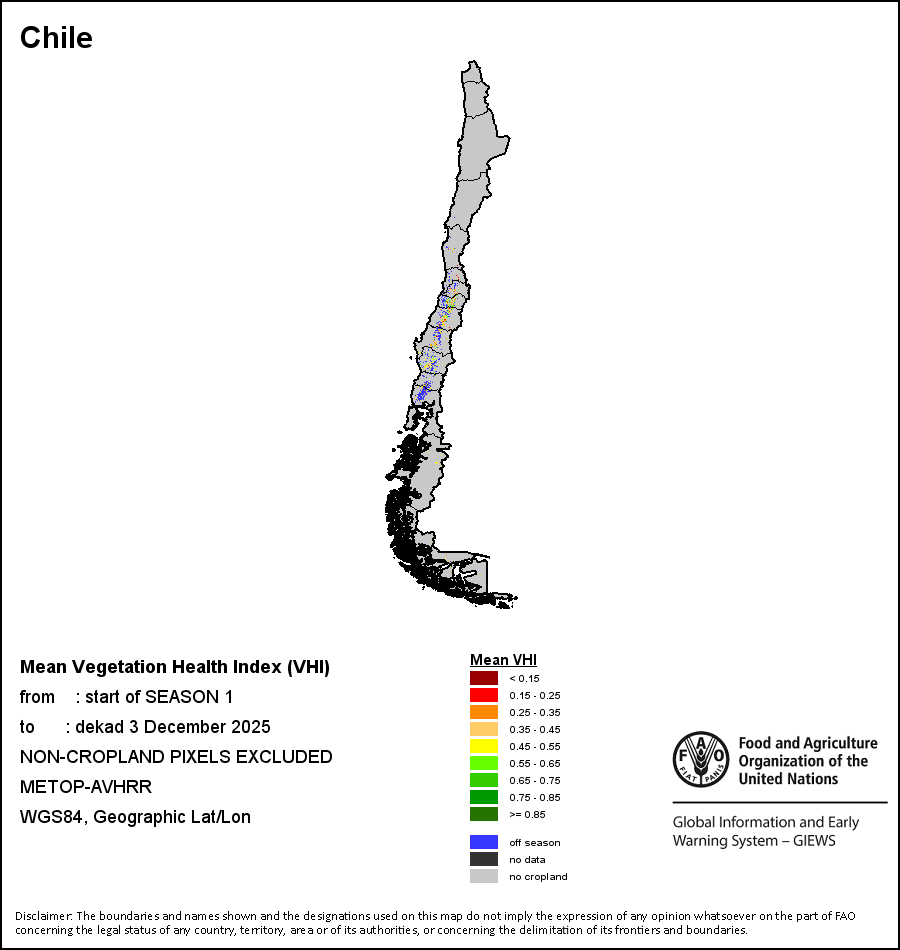 The country level maps and graphs depict the latest 36-month period of the seasonal, vegetation and precipitation indicators. The data is presented by dekad and month. All three vegetation indicators are based on 10-day (dekadal) vegetation data from the METOP-AVHRR sensor at 1 km resolution (2007 and after). Data at 1 km resolution for the period 1984-2006 are derived from the NOAA-AVHRR dataset at 16 km resolution. Precipitation estimates for all African countries (except Cabo Verde and Mauritius) are taken from NOAA/FEWSNet (16 km resolution), while for the remaining countries data is obtained from ECMWF (25 km resolution). Owing to the higher resolution of vegetation indicators (e.g., NDVI, VHI) compared to coarser precipitation indicators, the number of sub-national units for which valid zonal statistics can be generated for vegetation indices is greater than the number of units for precipitation indicators for certain countries.