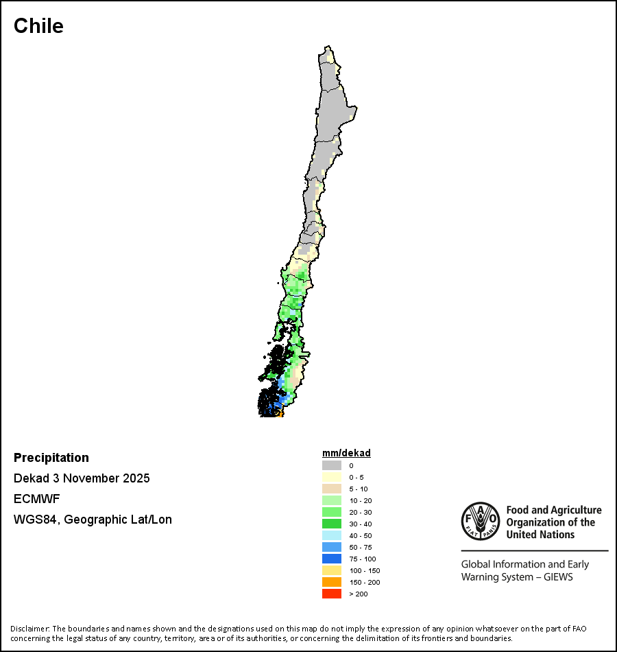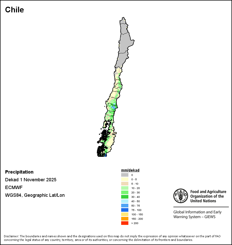 The map depicts cumulative rainfall volumes over a dekad (a 10-day period). Precipitation estimates for all African countries (except Cabo Verde and Mauritius) are taken from NOAA/FEWSNet, while for the remaining countries data is obtained from ECMWF.