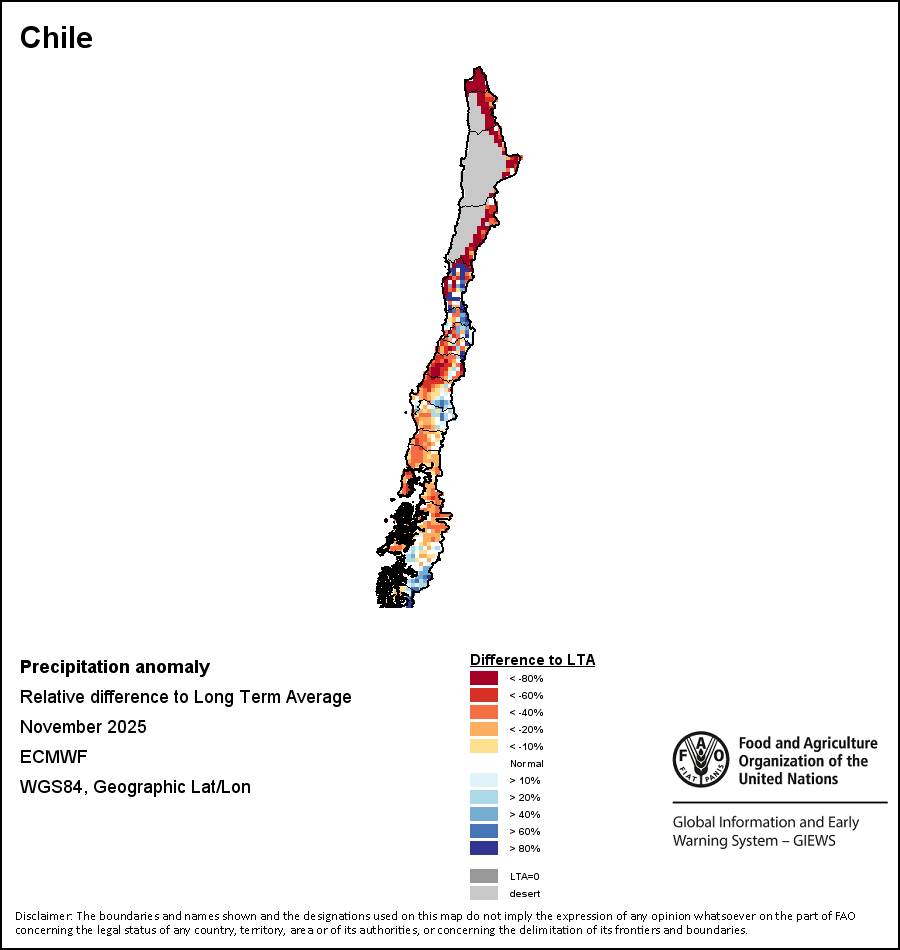 The map illustrates the difference between the current rainfall volume and the average level. Rainfall levels are compared with the Long-Term Average (LTA), which refers to the period 1989-2015. Warmer colours identify areas which have received lower-than-average rainfall, while colder colours are given to areas where precipitation has been above average.