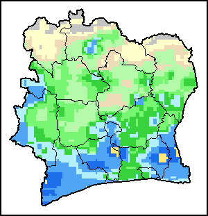 توضح الخريطة الاختلاف بين كمية الهطولات المطرية الراهنة ومعدلها. تقارَن مستويات الهطولات المطرية مع المعدل طويل الأجل الذي يشير إلى الفترة ما بين 1989-2015.