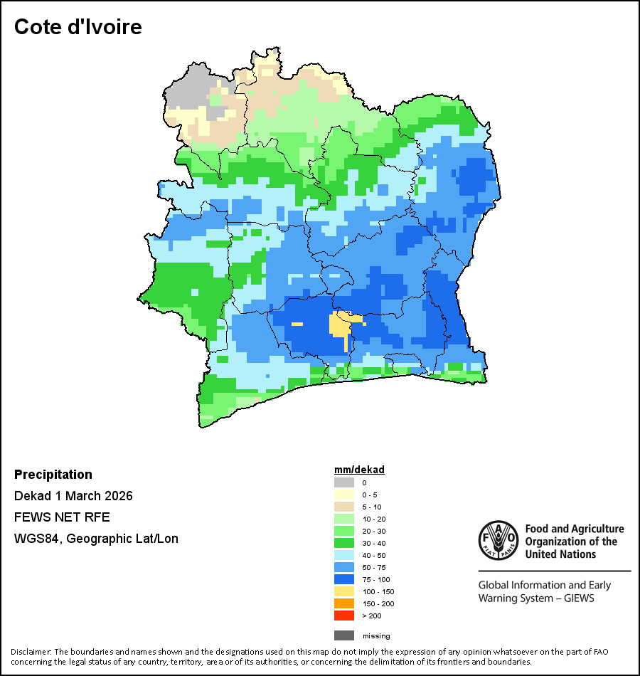 The map depicts cumulative rainfall volumes over a dekad (a 10-day period). Precipitation estimates for all African countries (except Cabo Verde and Mauritius) are taken from NOAA/FEWSNet, while for the remaining countries data is obtained from ECMWF.