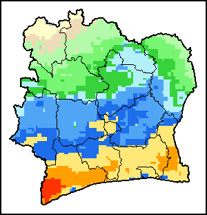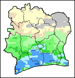 Los mapas y gráficos nacionales representan el último periodo de 36 meses de los indicadores estacionales, de vegetación y de precipitación. Los datos se presentan por periodos de 10 días y por meses. Los tres indicadores de vegetación se basan en datos de vegetación registrados cada diez días por el sensor METOP-AVHRR con una resolución de 1km (2007 y posterior). Los datos con una resolución de 1km del período 1984-2006 se extrapolaron a partir del conjunto de datos NOAA-AVHRR con 16km de resolución. Las estimaciones de precipitación de todos los países africanos (excepto Cabo Verde y Mauricio) se obtienen de NOAA/FEWSNet (16km de resolución), mientras que para los restantes países los datos se obtienen Centro Europeo de Predicción Meteorológica a Plazo Medio (ECMWF siglas en Inglés, 25km de resolución). Debido a la mayor resolución de los indicadores de vegetación (p.ej., NDVI, VHI) en comparación con los indicadores de precipitación de resolución más gruesa, el número de unidades subnacionales para las que se pueden generar estadísticas zonales válidas para los índices de vegetación es mayor que el número de unidades para los indicadores de precipitación en algunos países.