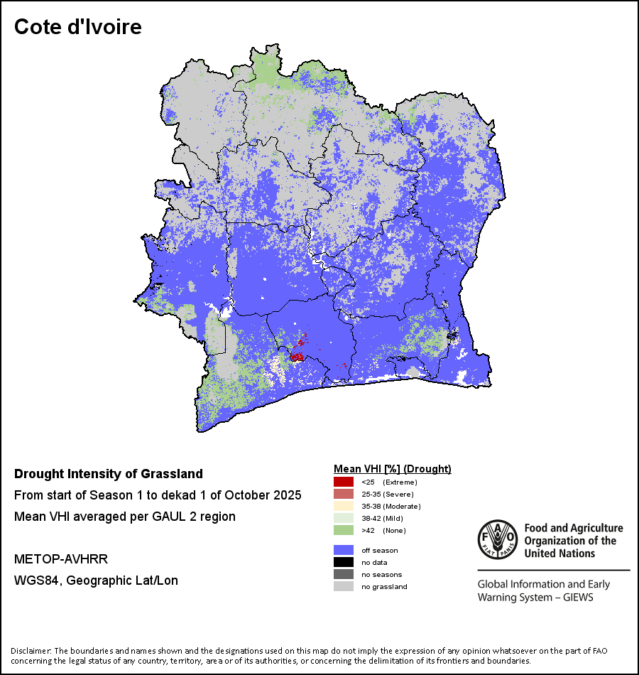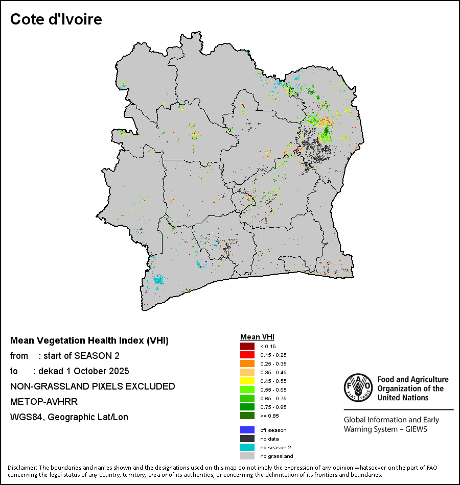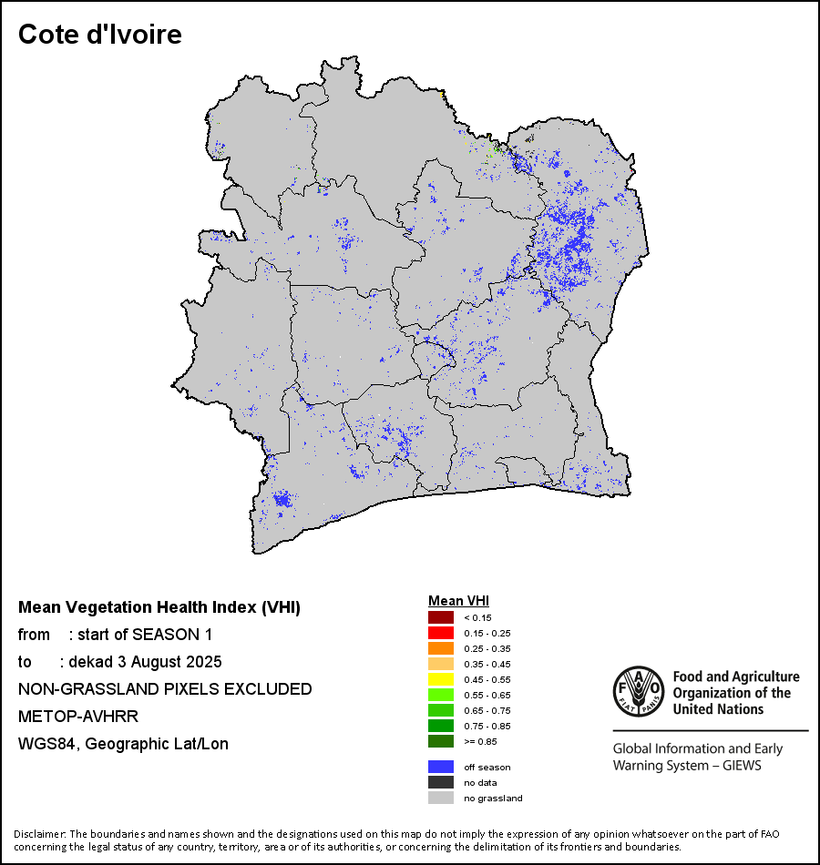 国别地图和图表显示的是最近36个月期间的季节、植被和降水指标。数据按每10天和每月呈现。   更多