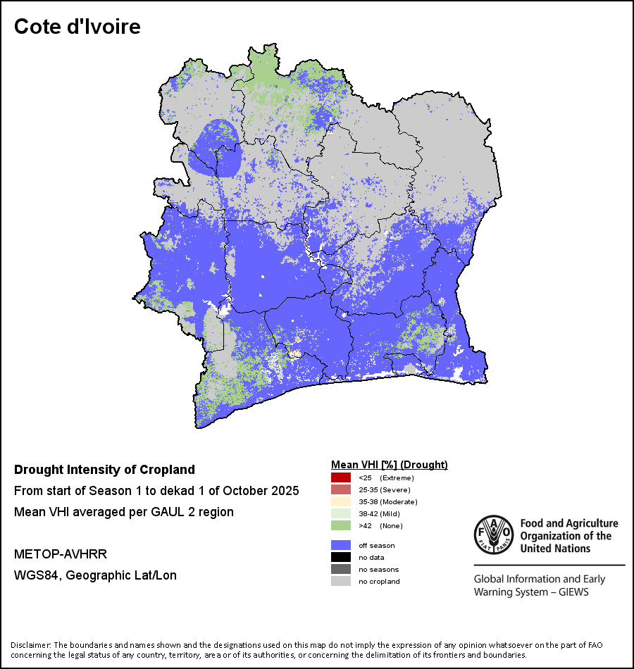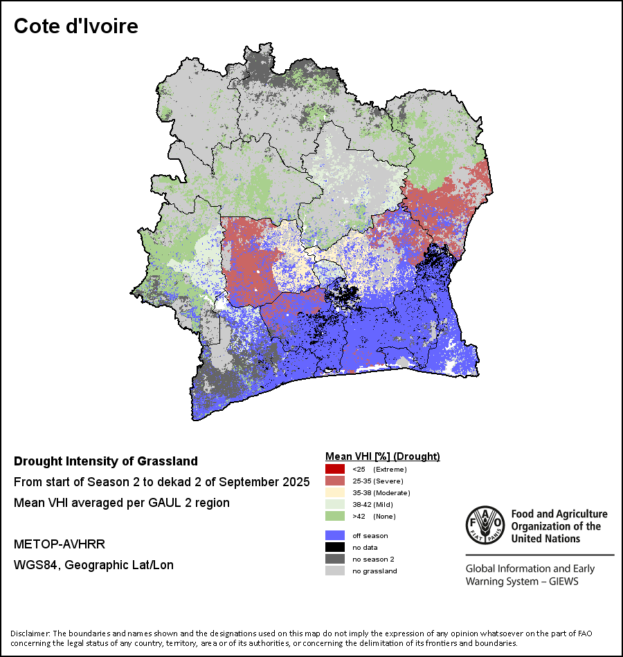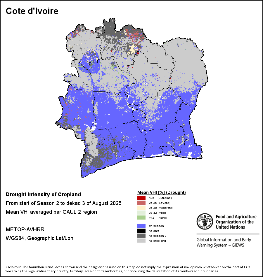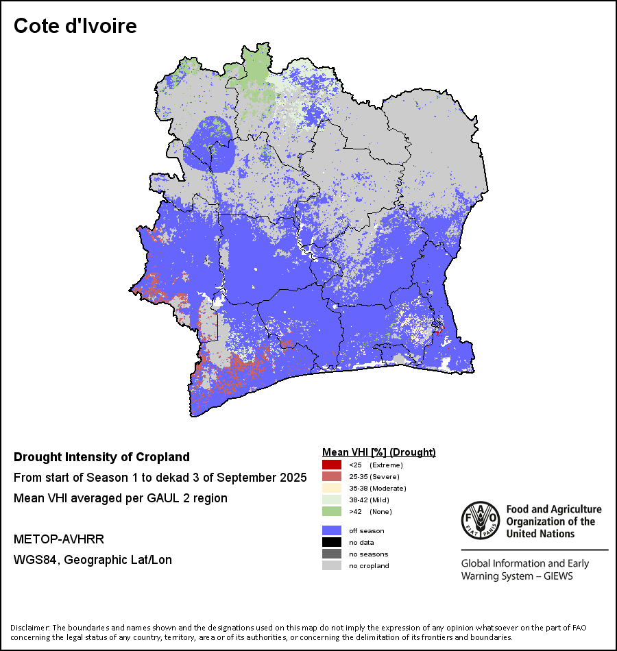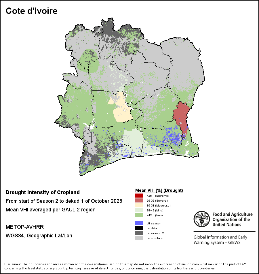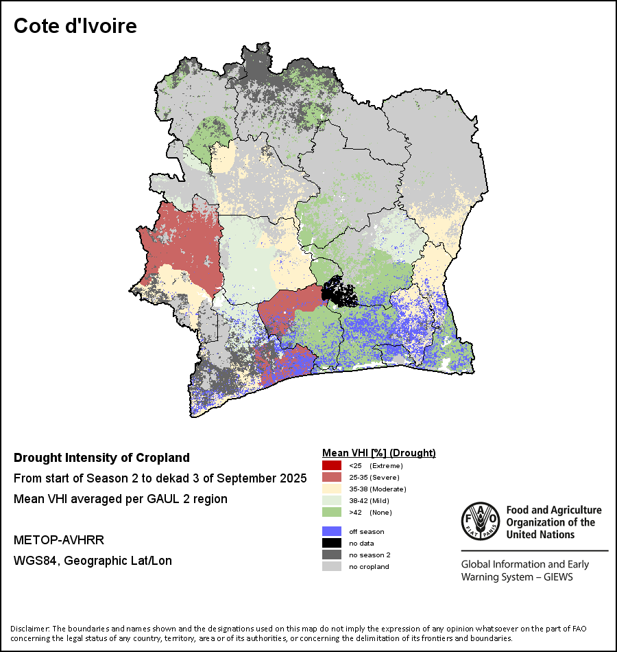 农业干旱依据其强度划分为四类:极端、严重、重度或轻度。干旱的强度通过各全球行政单位分层制度二级区域(GAUL 2)地区累积加权平均植被健康指数计算得出,意味着植被健康状况越差旱情就越严重。
