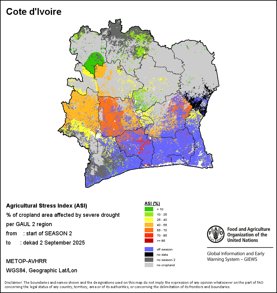 农业干旱胁迫指数(ASI)是一项速览指数,有助于在早期甄别较大可能发生水胁迫(干旱)的耕地。 该指数通过整合植被健康指数(VHI)在评估农业旱情方面具有关键意义的两个维度,即时间和空间维度,而得出。计算农业干旱胁迫指数的第一步是求植被健康指数的时间平均值,对作物周期内旱情的强度和时长进行像素级评估;这项计算包括采用作物系数衡量某种作物在各物候阶段对干旱胁迫的敏感度。第二步是确定旱情的空间广度,方法是计算植被健康指数值低于35%(Kogan前期研究将这一数值确定为评估干旱程度的临界值,1995年)的耕地的像素百分比。然后把各个行政区域根据受影响面积的百分比进行划分,便于对结果进行快速解读。