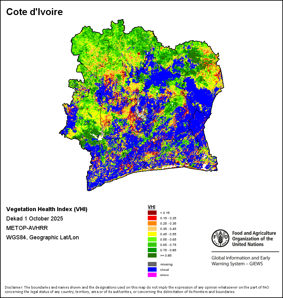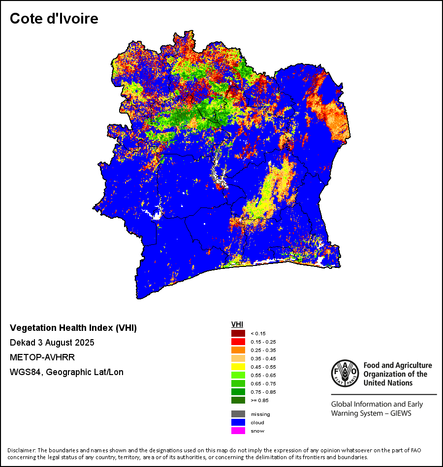 植被健康指数(VHI)根据植被健康状况以及气温对作物状况的影响情况显示干旱的严重程度。 VHI是一项综合指数,是用于计算ASI的基础性指标。它结合了植被状况指数(VCI)和气温状况指数(TCI)。TCI的计算采用了与VCI类似的方程,但它把当前气温与长期最高和最低值联系起来,因为一个假定前提是气温越高就倾向于造成植被状况恶化。比方说,VHI指数下降就意味着植被状况相对较差,而气温越高则意味着植被状况受到胁迫,较长时间延续则成为干旱的指征。VHI映像针对两个主要季节进行计算并分为三种时间模式:旬度、月度和年度。