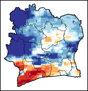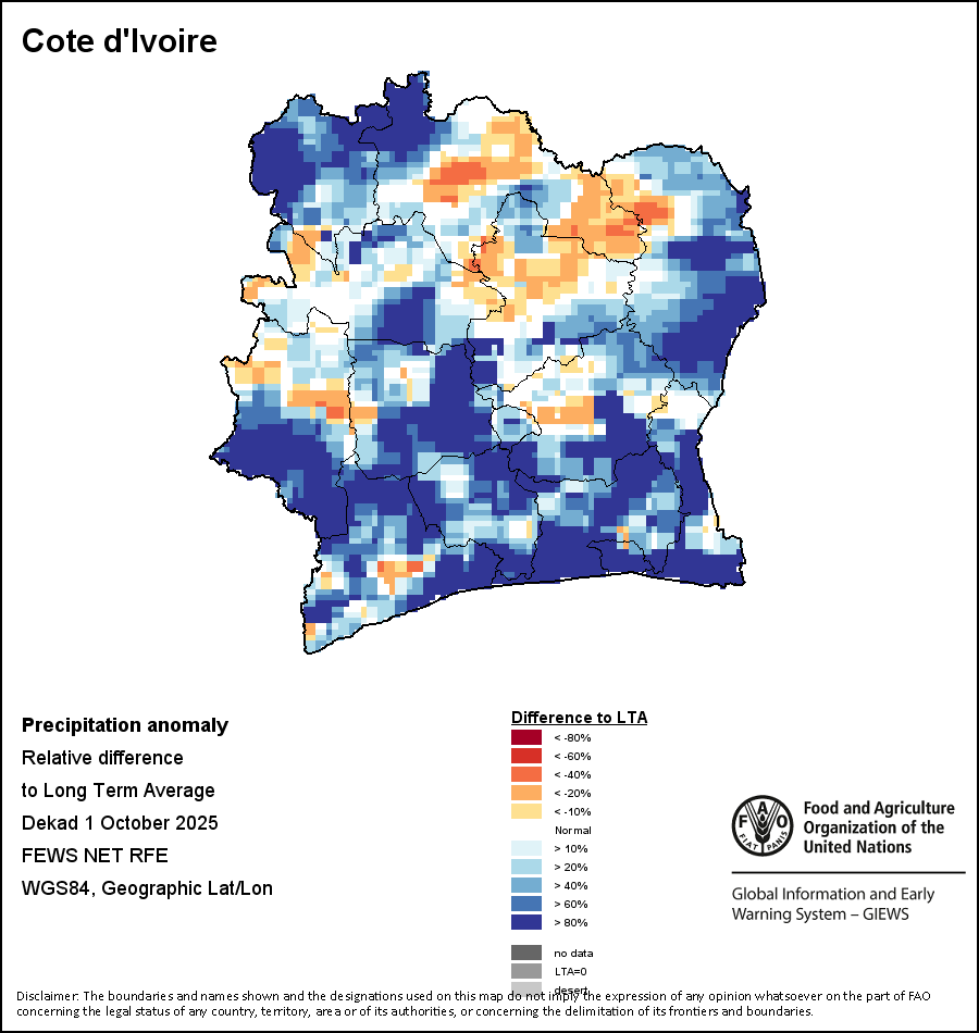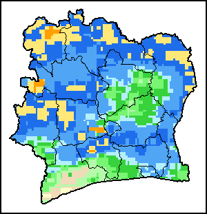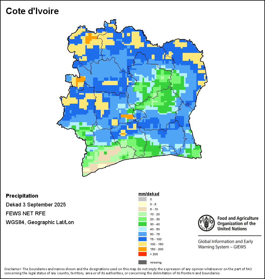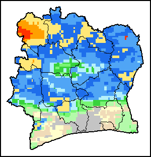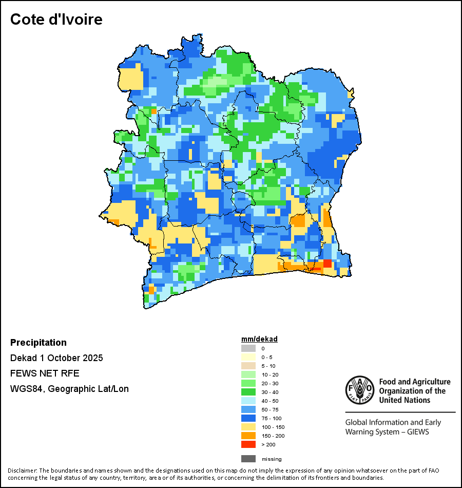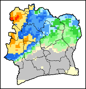 该图谱显示了每一旬(十天)的累积降水量。 所有非洲国家的降水量估算(除佛得角和毛里求斯外)均取自NOAA/FEWSNet,其他国家则取自ECMWF。