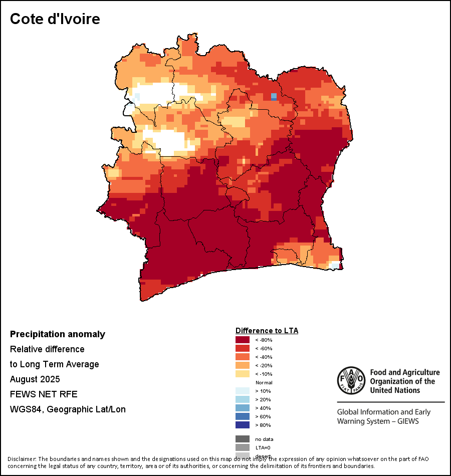 该图谱显示了当前降水量与平均水平之间的差异。 由降水量水平与长期平均值(LTA)进行比较得出,长期平均值系指1989-2015年期间的数值。暖色调指示的是降水量低于平均水平的地区,而冷色调指示的则是降水量高于平均水平的地区。降雨量估算数据来自欧洲中期天气预报这些(ECMWF)。