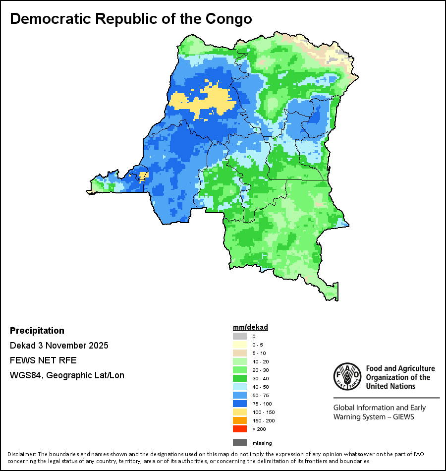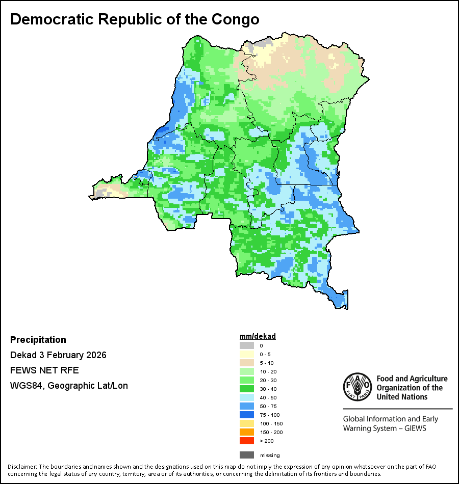 La carte illustre les volumes cumulés de précipitations au cours d’une décade (une période de 10 jours). Les estimations concernant les précipitations pour tous les pays africains (à l'exception du Cap Vert et de Maurice) proviennent du NOAA/FEWSNet, tandis que les données concernant les autres pays sont obtenues à partir du CEPMMT.