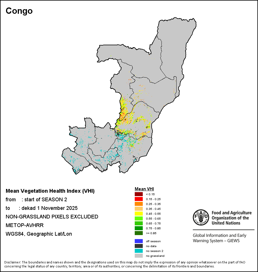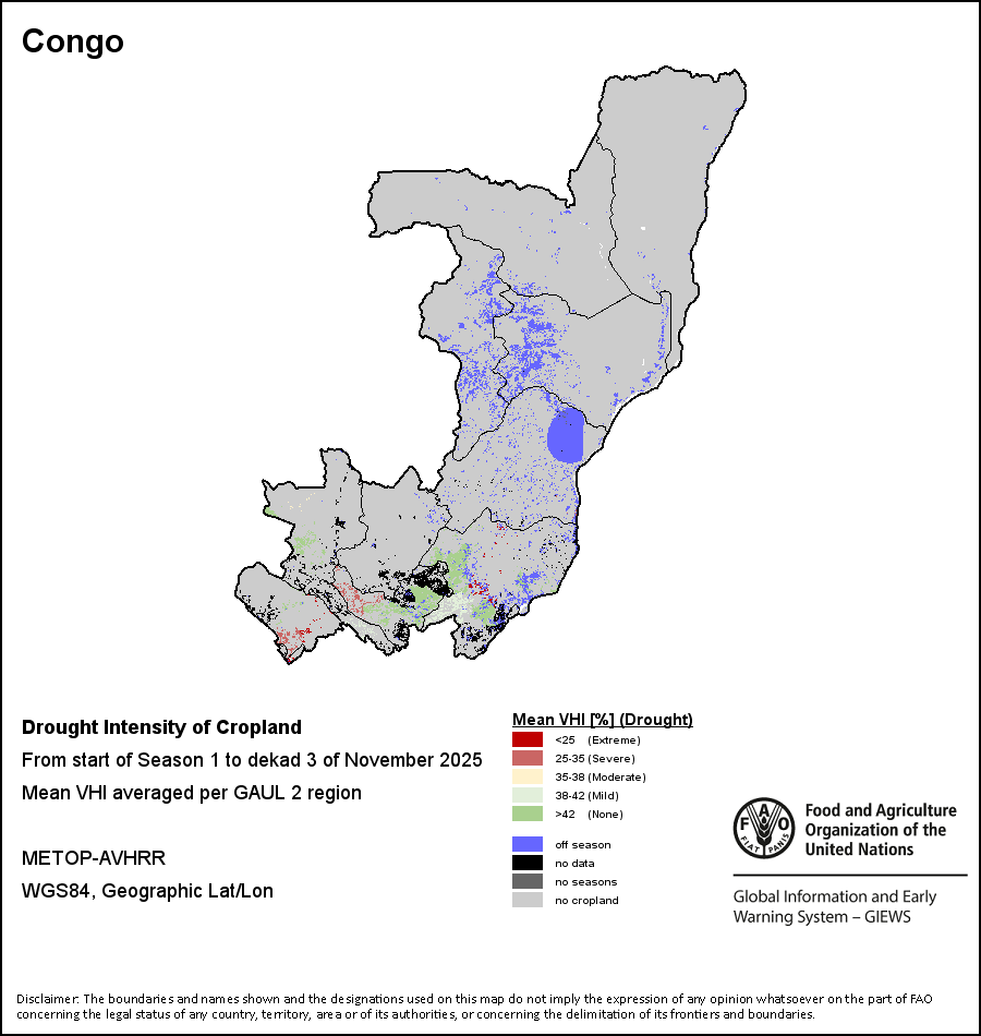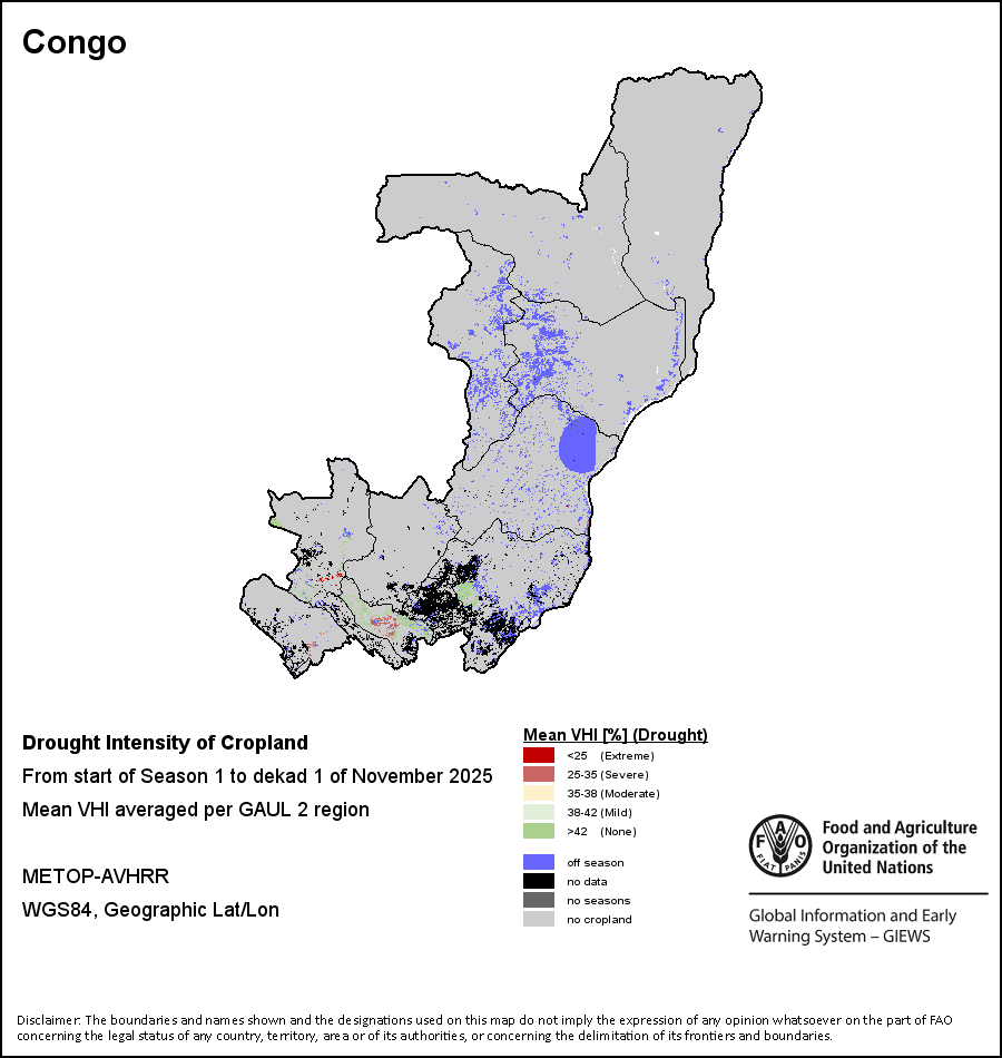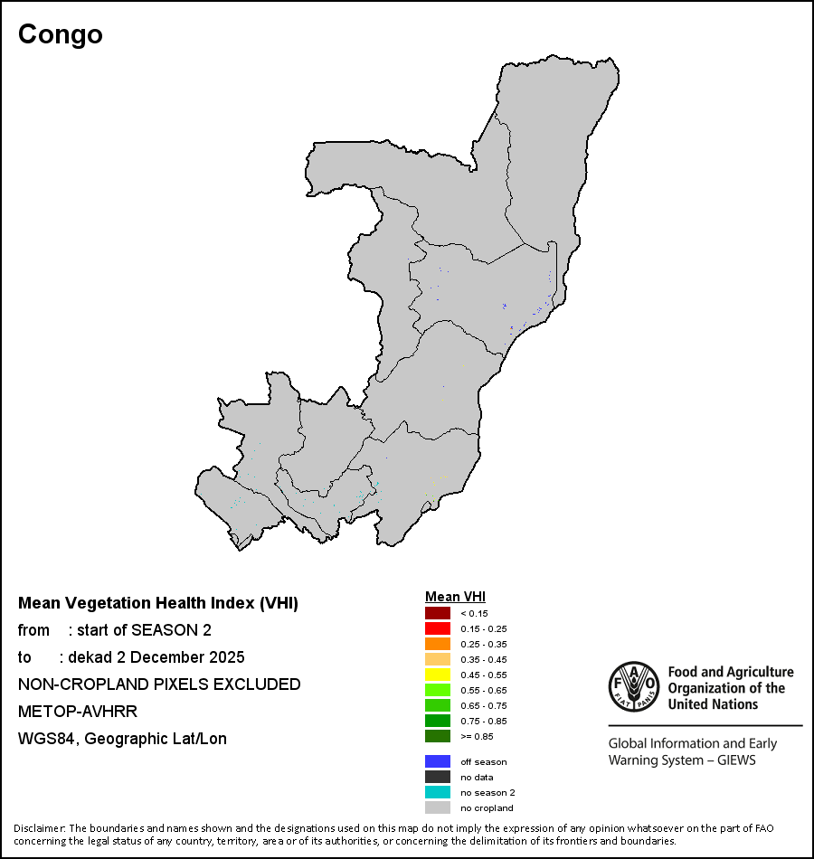 The country level maps and graphs depict the latest 36-month period of the seasonal, vegetation and precipitation indicators. The data is presented by dekad and month. All three vegetation indicators are based on 10-day (dekadal) vegetation data from the METOP-AVHRR sensor at 1 km resolution (2007 and after). Data at 1 km resolution for the period 1984-2006 are derived from the NOAA-AVHRR dataset at 16 km resolution. Precipitation estimates for all African countries (except Cabo Verde and Mauritius) are taken from NOAA/FEWSNet (16 km resolution), while for the remaining countries data is obtained from ECMWF (25 km resolution). Owing to the higher resolution of vegetation indicators (e.g., NDVI, VHI) compared to coarser precipitation indicators, the number of sub-national units for which valid zonal statistics can be generated for vegetation indices is greater than the number of units for precipitation indicators for certain countries.