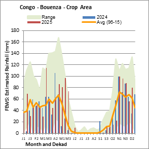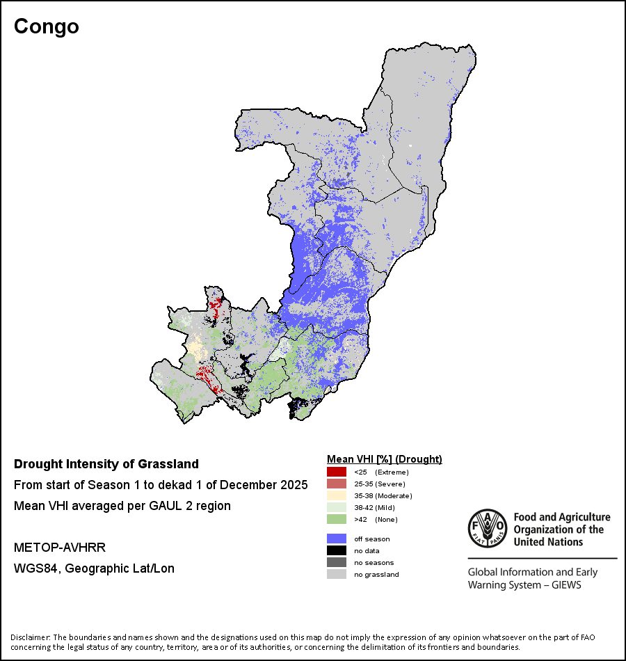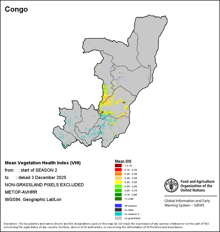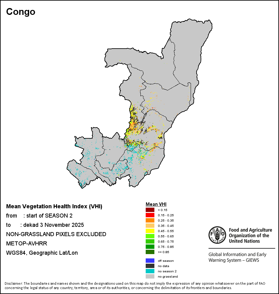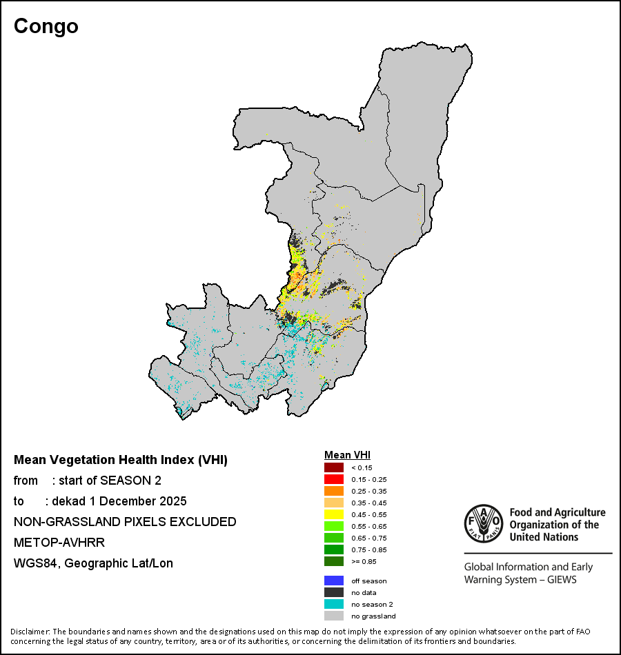 The country level maps and graphs depict the latest 36-month period of the seasonal, vegetation and precipitation indicators. The data is presented by dekad and month. All three vegetation indicators are based on 10-day (dekadal) vegetation data from the METOP-AVHRR sensor at 1 km resolution (2007 and after). Data at 1 km resolution for the period 1984-2006 are derived from the NOAA-AVHRR dataset at 16 km resolution. Precipitation estimates for all African countries (except Cabo Verde and Mauritius) are taken from NOAA/FEWSNet (16 km resolution), while for the remaining countries data is obtained from ECMWF (25 km resolution). Owing to the higher resolution of vegetation indicators (e.g., NDVI, VHI) compared to coarser precipitation indicators, the number of sub-national units for which valid zonal statistics can be generated for vegetation indices is greater than the number of units for precipitation indicators for certain countries.