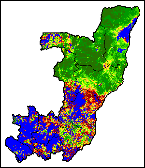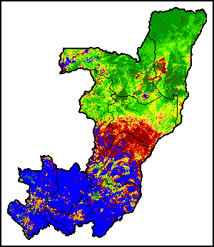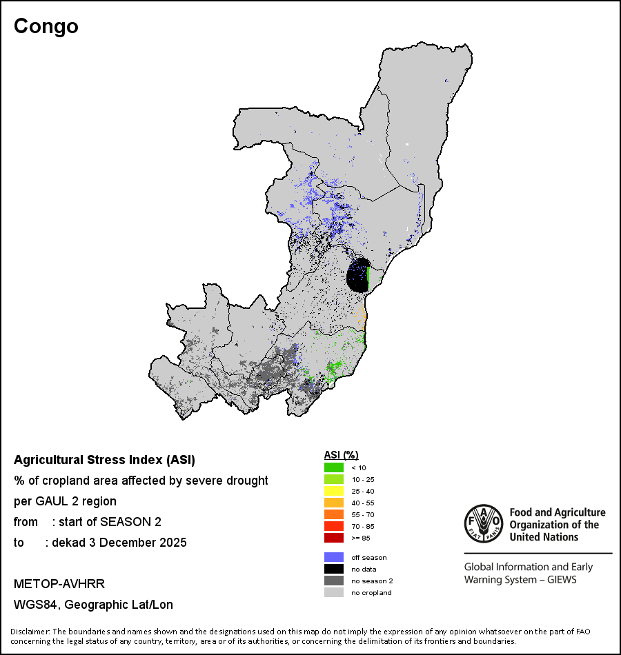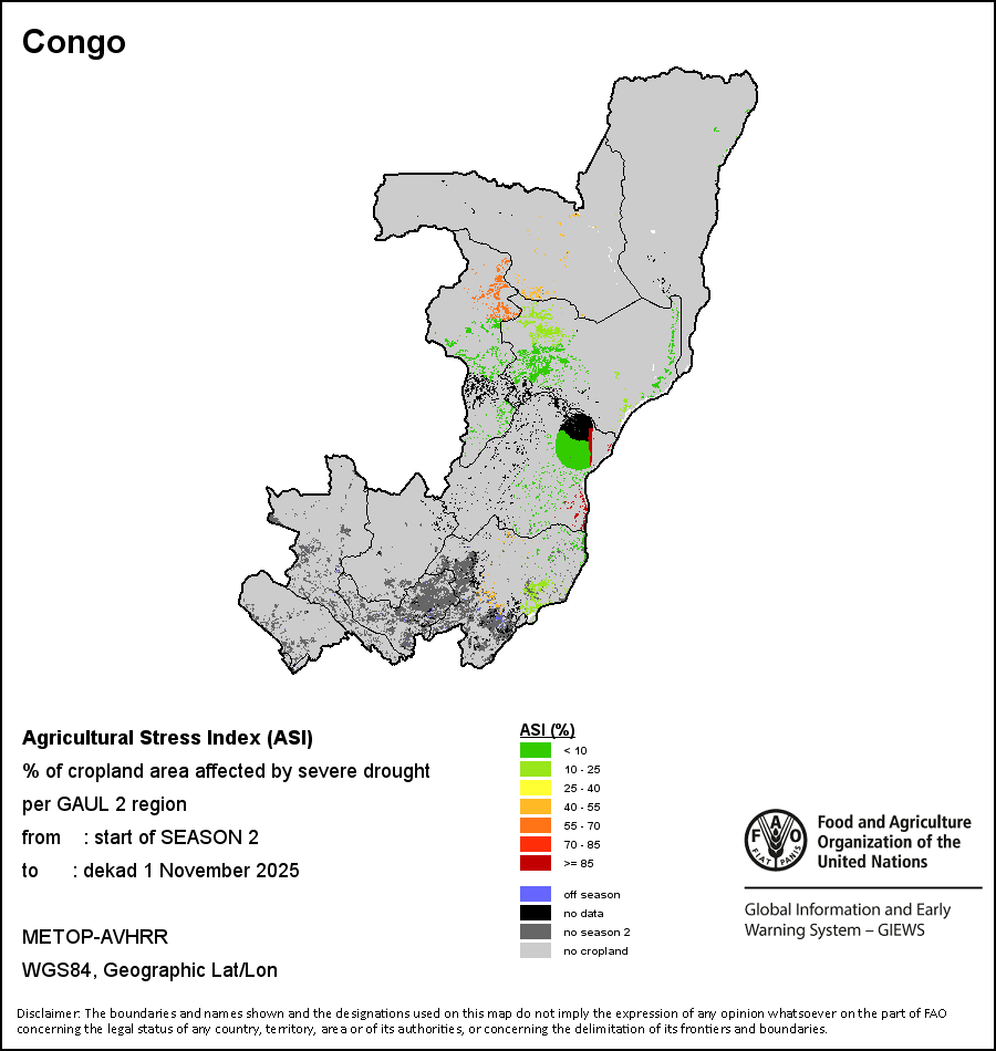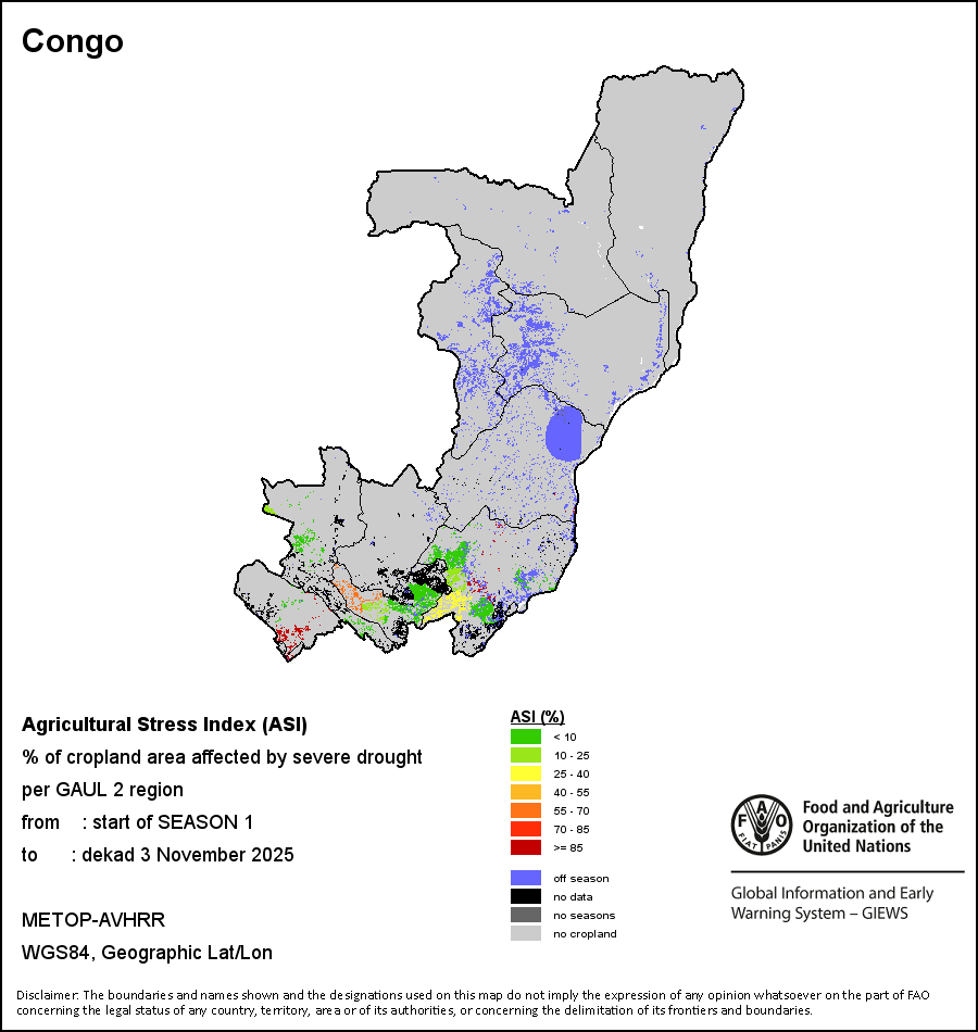 The Agricultural Stress Index (ASI) is a quick-look indicator that facilitates the early identification of cropped land with a high likelihood of water stress (drought). The Index is based on the integration of the Vegetation Health Index (VHI) in two dimensions that are critical in the assessment of a drought event in agriculture: temporal and spatial. The first step of the ASI calculation is a temporal averaging of the VHI, assessing the intensity and duration of dry periods occurring during the crop cycle at the pixel level; this calculation includes the use of crop coefficients, which introduces sensitivity of a crop to water stress during each phenological phase. The second step determines the spatial extent of drought events by calculating the percentage of pixels in arable areas with a VHI value below 35 percent (this value was identified as a critical threshold in assessing the extent of drought in previous research by Kogan, 1995). Each administrative area is classified according to the percentage of the affected area to facilitate the quick interpretation of results.