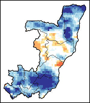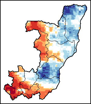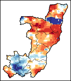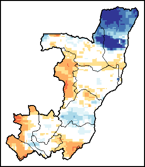 The map illustrates the difference between the current rainfall volume and the average level. Rainfall levels are compared with the Long-Term Average (LTA), which refers to the period 1989-2015. Warmer colours identify areas which have received lower-than-average rainfall, while colder colours are given to areas where precipitation has been above average.