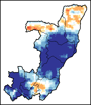 The Normalized Difference Vegetation Index (NDVI) measures the “greenness” of ground cover and is used as a proxy to indicate the density and health of vegetation. NDVI values range from +1 to -1, with high positive values corresponding to dense and healthy vegetation, and low and/or negative NDVI values indicating poor vegetation conditions or sparse vegetative cover. The NDVI anomaly indicates the variation of the current dekad to the long-term average, where a positive value (for example 20 percent) would signify enhanced vegetation conditions compared to the average, while a negative value (for instance -40 percent) would indicate comparatively poor vegetation conditions.