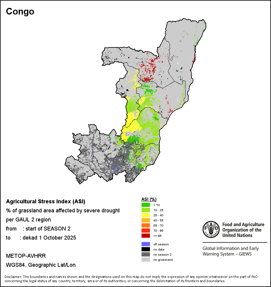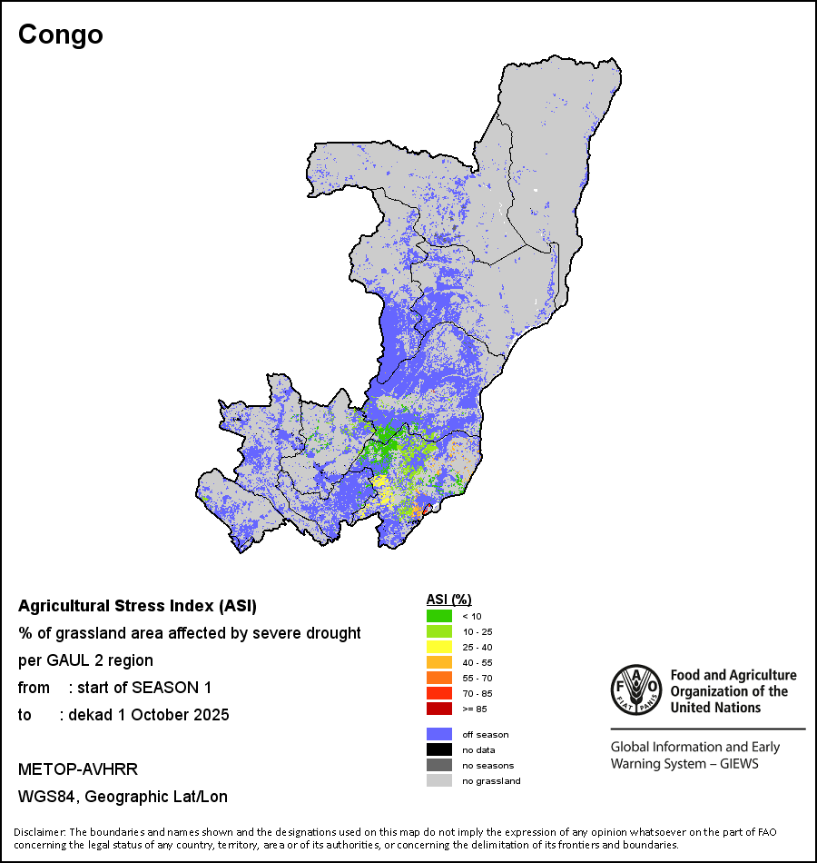农业干旱胁迫指数(ASI)是一项速览指数,有助于在早期甄别较大可能发生水胁迫(干旱)的耕地。 该指数通过整合植被健康指数(VHI)在评估农业旱情方面具有关键意义的两个维度,即时间和空间维度,而得出。计算农业干旱胁迫指数的第一步是求植被健康指数的时间平均值,对作物周期内旱情的强度和时长进行像素级评估;这项计算包括采用作物系数衡量某种作物在各物候阶段对干旱胁迫的敏感度。第二步是确定旱情的空间广度,方法是计算植被健康指数值低于35%(Kogan前期研究将这一数值确定为评估干旱程度的临界值,1995年)的耕地的像素百分比。然后把各个行政区域根据受影响面积的百分比进行划分,便于对结果进行快速解读。