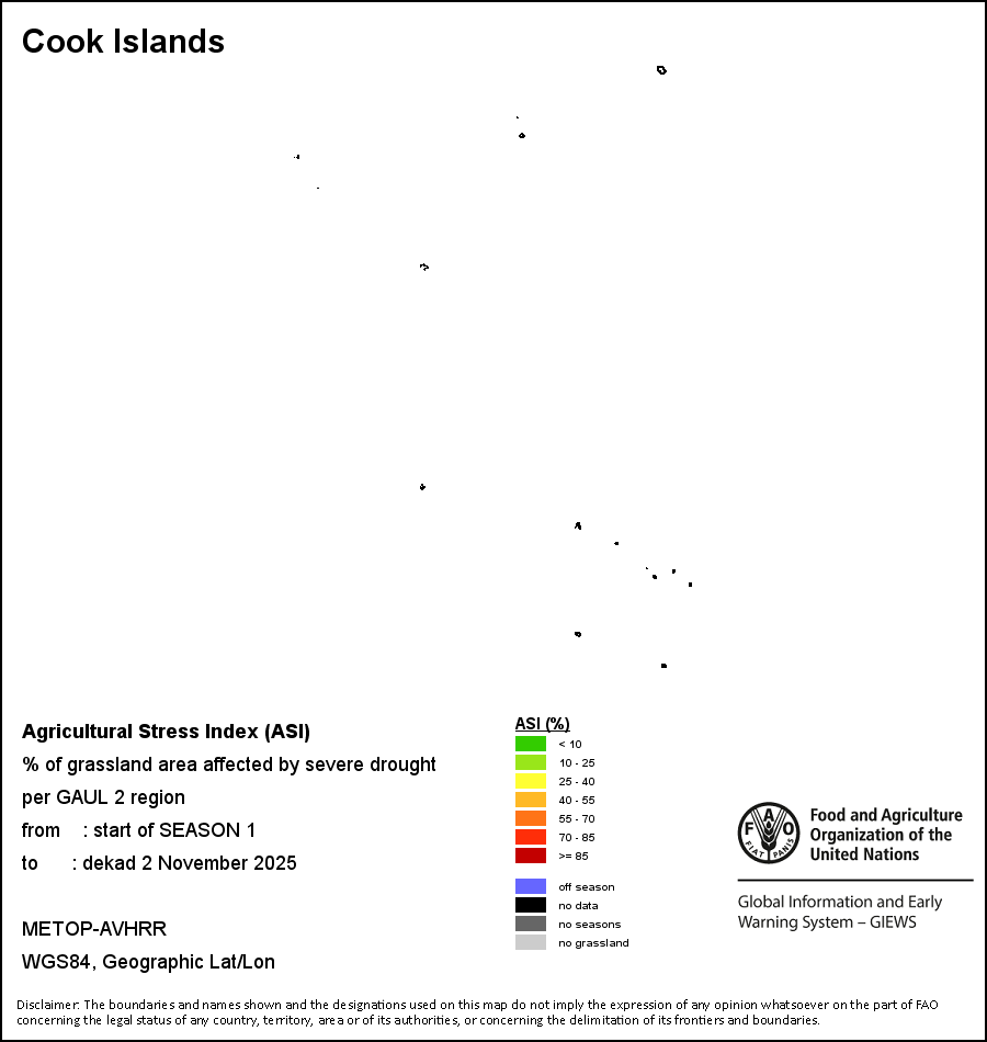 The Agricultural Stress Index (ASI) is a quick-look indicator that facilitates the early identification of cropped land with a high likelihood of water stress (drought). The Index is based on the integration of the Vegetation Health Index (VHI) in two dimensions that are critical in the assessment of a drought event in agriculture: temporal and spatial. The first step of the ASI calculation is a temporal averaging of the VHI, assessing the intensity and duration of dry periods occurring during the crop cycle at the pixel level; this calculation includes the use of crop coefficients, which introduces sensitivity of a crop to water stress during each phenological phase. The second step determines the spatial extent of drought events by calculating the percentage of pixels in arable areas with a VHI value below 35 percent (this value was identified as a critical threshold in assessing the extent of drought in previous research by Kogan, 1995). Each administrative area is classified according to the percentage of the affected area to facilitate the quick interpretation of results.