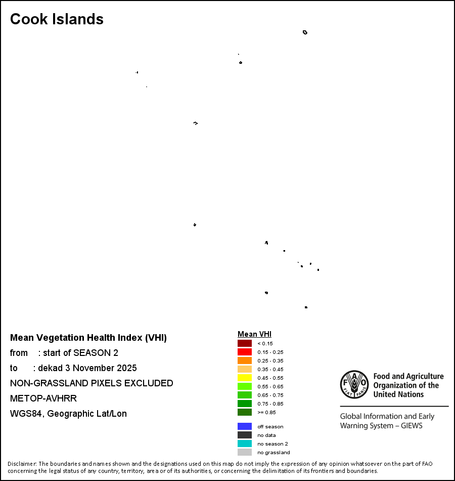 The country level maps and graphs depict the latest 36-month period of the seasonal, vegetation and precipitation indicators. The data is presented by dekad and month. All three vegetation indicators are based on 10-day (dekadal) vegetation data from the METOP-AVHRR sensor at 1 km resolution (2007 and after). Data at 1 km resolution for the period 1984-2006 are derived from the NOAA-AVHRR dataset at 16 km resolution. Precipitation estimates for all African countries (except Cabo Verde and Mauritius) are taken from NOAA/FEWSNet (16 km resolution), while for the remaining countries data is obtained from ECMWF (25 km resolution). Owing to the higher resolution of vegetation indicators (e.g., NDVI, VHI) compared to coarser precipitation indicators, the number of sub-national units for which valid zonal statistics can be generated for vegetation indices is greater than the number of units for precipitation indicators for certain countries.