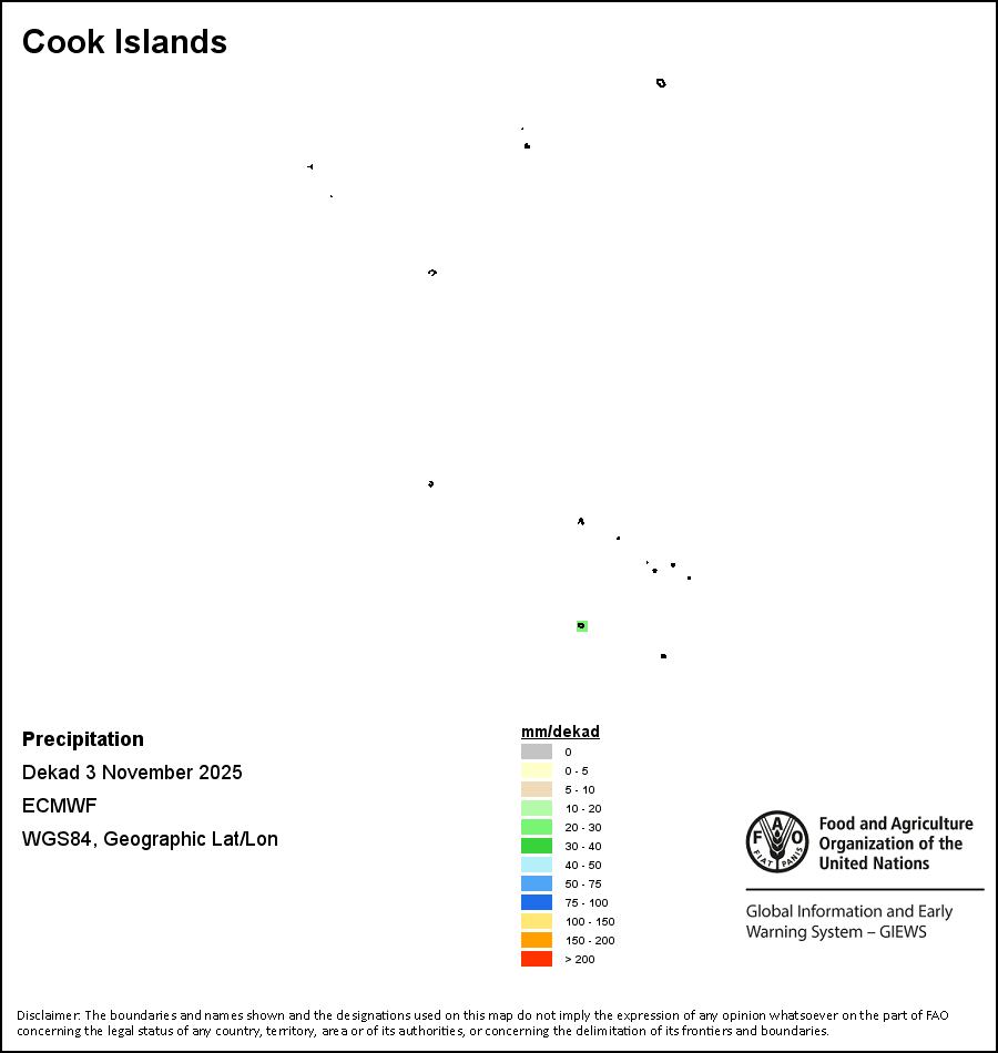 The map depicts cumulative rainfall volumes over a dekad (a 10-day period). Precipitation estimates for all African countries (except Cabo Verde and Mauritius) are taken from NOAA/FEWSNet, while for the remaining countries data is obtained from ECMWF.