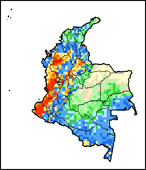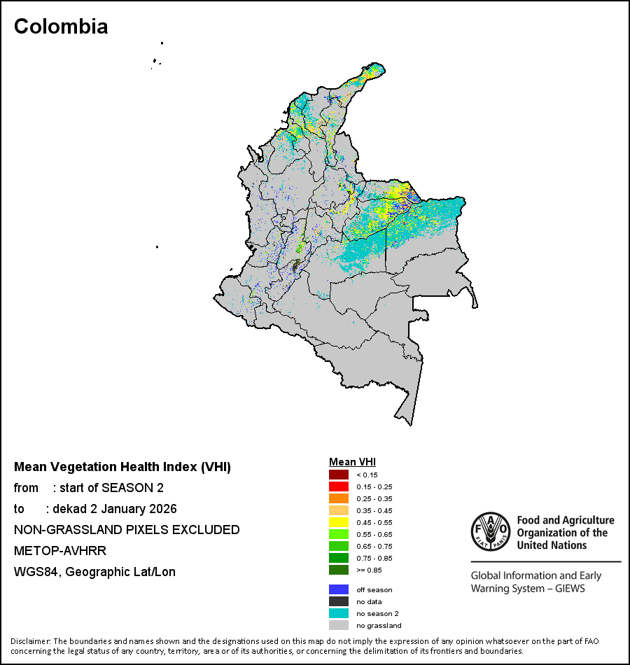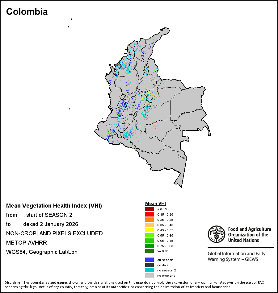 Индекс здоровья растительности (VHI) иллюстрирует серьезность засухи, основанной на здоровье растительности и влиянии температуры на состояние растений. VHI является составным индексом и элементарным индикатором, используемым для вычисления ASI. Он сочетает в себе как Индекс Состояния Растительности (VCI), так и Индекс Состояния Температуры (TCI). TCI рассчитывается с использованием аналогичного уравнения с VCI, но связывает текущую температуру с долгосрочным максимумом и минимумом, так как предполагается, что более высокие температуры, как правило, вызывают ухудшение состояния растительности. Например, уменьшение VHI будет означать относительно слабое состояние растительности и более высокие температуры, означающее ухудшение состояния растительности, что в течение более длительного периода будет свидетельствовать о засухе. Изображения VHI вычисляются для двух основных сезонов и трех модальностей: по-декадный, ежемесячный и годовой. |