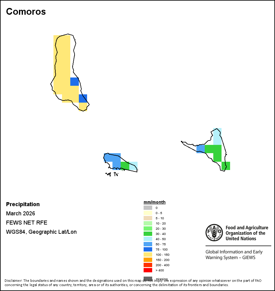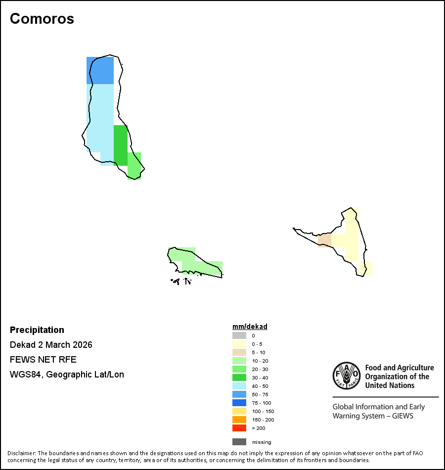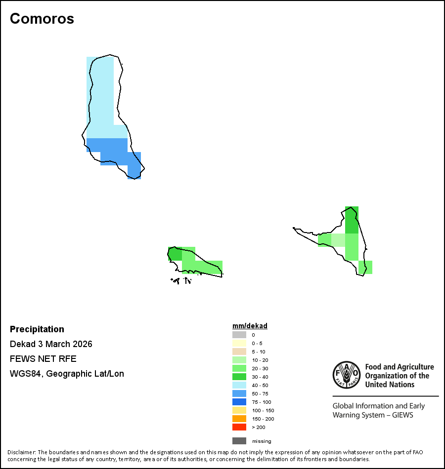 The country level maps and graphs depict the latest 36-month period of the seasonal, vegetation and precipitation indicators. The data is presented by dekad and month. All three vegetation indicators are based on 10-day (dekadal) vegetation data from the METOP-AVHRR sensor at 1 km resolution (2007 and after). Data at 1 km resolution for the period 1984-2006 are derived from the NOAA-AVHRR dataset at 16 km resolution. Precipitation estimates for all African countries (except Cabo Verde and Mauritius) are taken from NOAA/FEWSNet (16 km resolution), while for the remaining countries data is obtained from ECMWF (25 km resolution). Owing to the higher resolution of vegetation indicators (e.g., NDVI, VHI) compared to coarser precipitation indicators, the number of sub-national units for which valid zonal statistics can be generated for vegetation indices is greater than the number of units for precipitation indicators for certain countries.