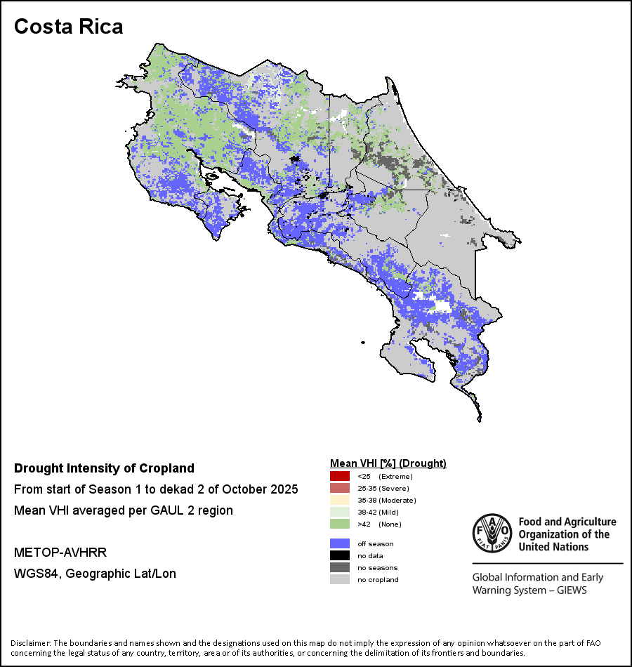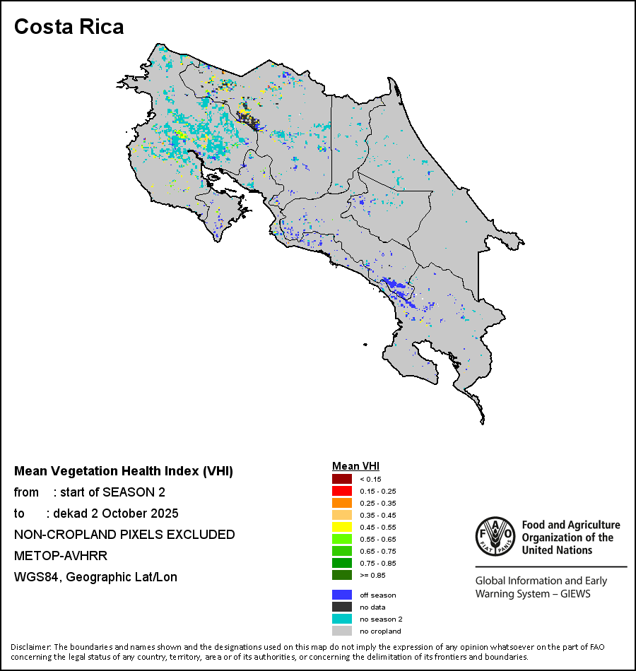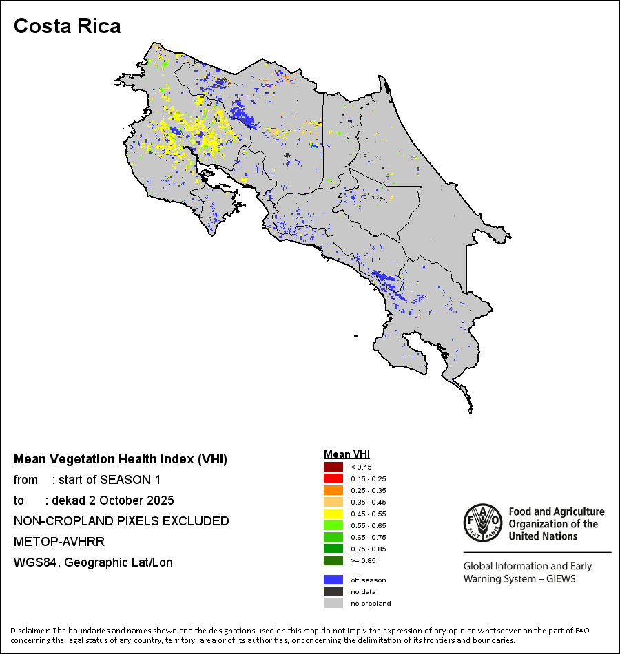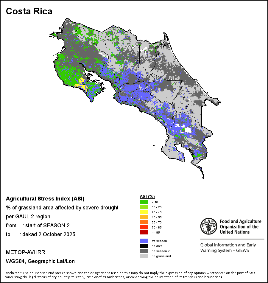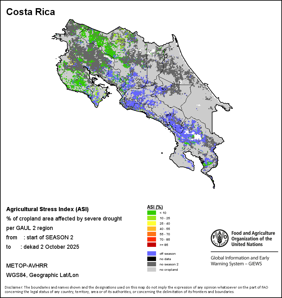 The Agricultural Stress Index (ASI) is a quick-look indicator that facilitates the early identification of cropped land with a high likelihood of water stress (drought). The Index is based on the integration of the Vegetation Health Index (VHI) in two dimensions that are critical in the assessment of a drought event in agriculture: temporal and spatial. The first step of the ASI calculation is a temporal averaging of the VHI, assessing the intensity and duration of dry periods occurring during the crop cycle at the pixel level; this calculation includes the use of crop coefficients, which introduces sensitivity of a crop to water stress during each phenological phase. The second step determines the spatial extent of drought events by calculating the percentage of pixels in arable areas with a VHI value below 35 percent (this value was identified as a critical threshold in assessing the extent of drought in previous research by Kogan, 1995). Each administrative area is classified according to the percentage of the affected area to facilitate the quick interpretation of results.