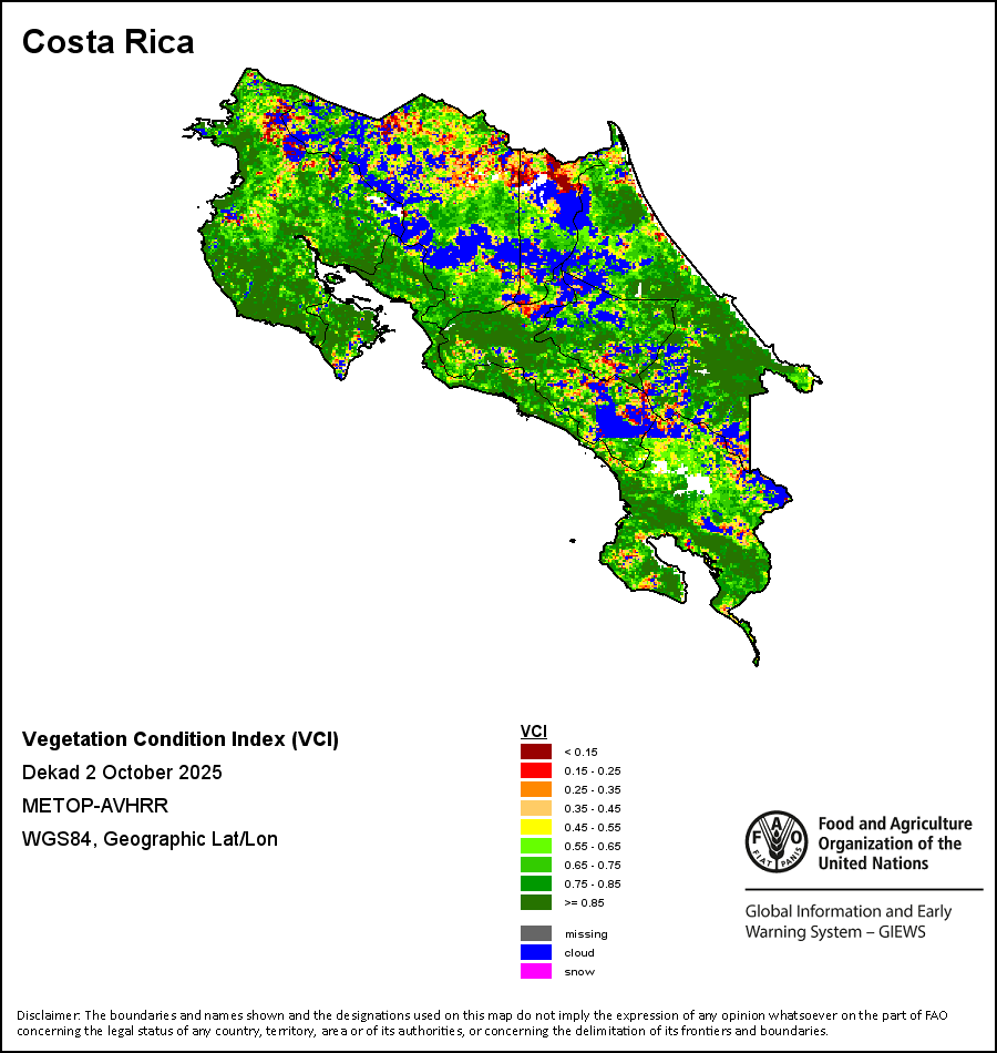 The Vegetation Condition Index (VCI) evaluates the current vegetation health in comparison to the historical trends. The VCI relates current dekadal Normalized Difference Vegetation Index (NDVI) to its long-term minimum and maximum, normalized by the historical range of NDVI values for the same dekad. The VCI was designed to separate the weather-related component of the NDVI from the ecological element.