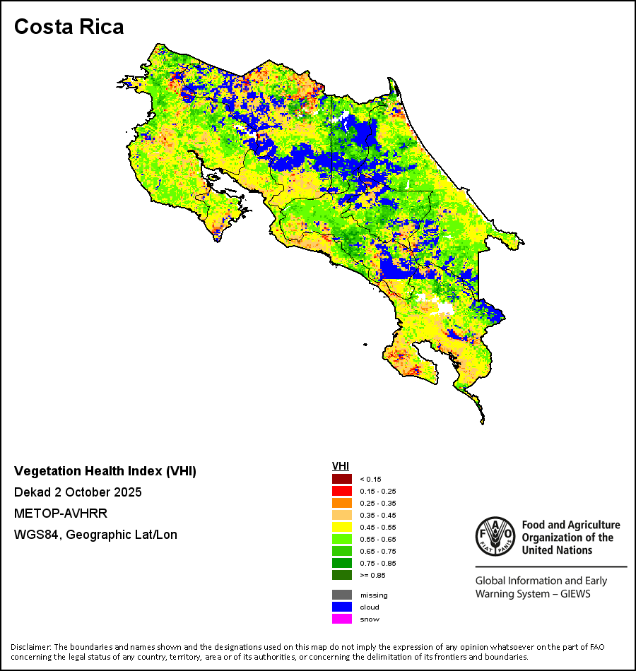 The Vegetation Health Index (VHI) illustrates the severity of drought based on the vegetation health and the influence of temperature on plant conditions. The VHI is a composite index and the elementary indicator used to compute the ASI. It combines both the Vegetation Condition Index (VCI) and the Temperature Condition Index (TCI). The TCI is calculated using a similar equation to the VCI, but relates the current temperature to the long-term maximum and minimum , as it is assumed that higher temperatures tend to cause a deterioration in vegetation conditions. A decrease in the VHI would, for example, indicate relatively poor vegetation conditions and warmer temperatures, signifying stressed vegetation conditions, and over a longer period would be indicative of drought. The VHI images are computed for the two main seasons and in three modalities: dekadal, monthly and annual.