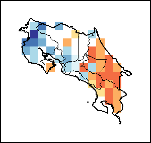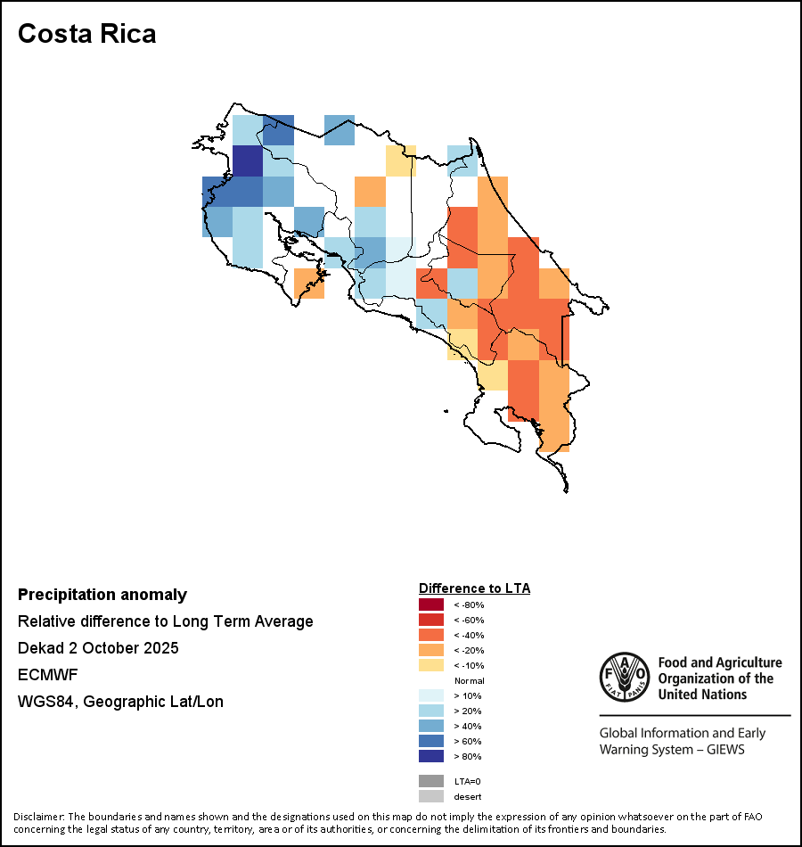 The map illustrates the difference between the current rainfall volume and the average level. Rainfall levels are compared with the Long-Term Average (LTA), which refers to the period 1989-2015. Warmer colours identify areas which have received lower-than-average rainfall, while colder colours are given to areas where precipitation has been above average.