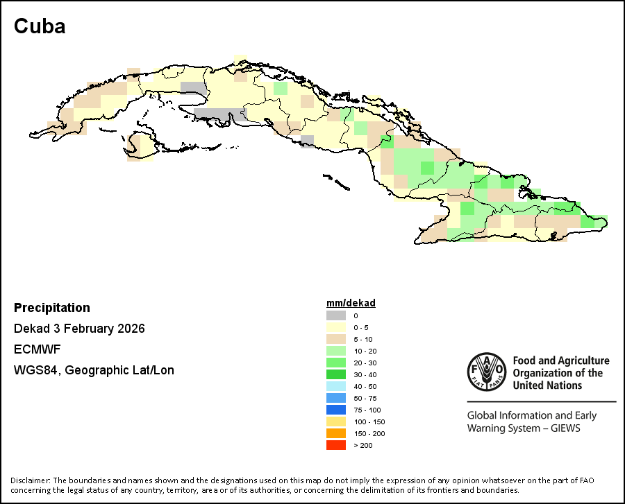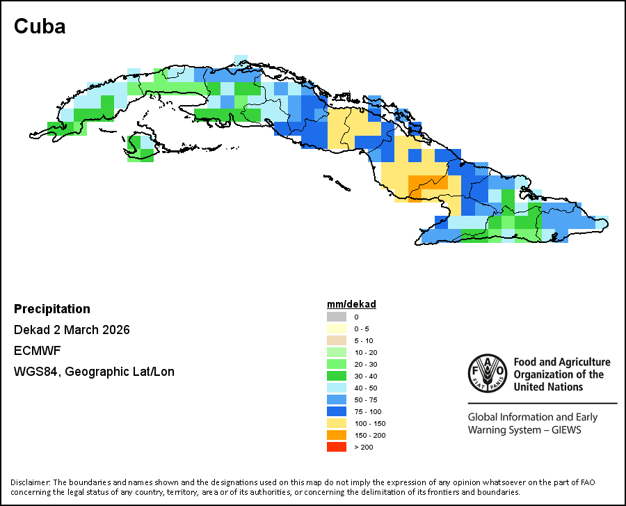 The map depicts cumulative rainfall volumes over a dekad (a 10-day period). Precipitation estimates for all African countries (except Cabo Verde and Mauritius) are taken from NOAA/FEWSNet, while for the remaining countries data is obtained from ECMWF.
